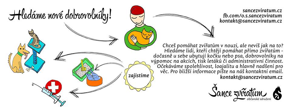 Jezdíme s prodejním stánkem na různé slavnosti, kde oceníme pomocnou ruku. Pokud máte rádi kočičky, budeme rádi za pomoc i na umisťovacích výstavách. Napsat nám můžete na kontakt@sancezviratum nebo na Facebook (skupina pro dobrovolníky)