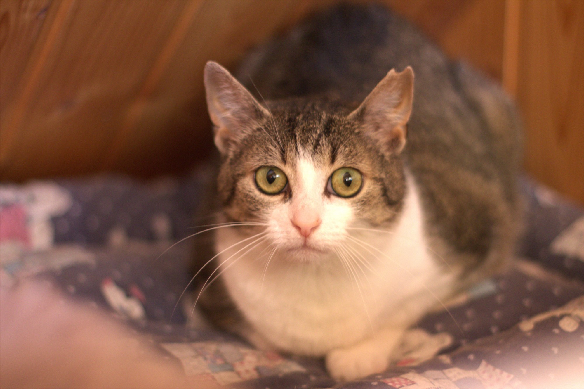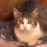 Kočičí puberťačka přijela z lokality v Harrachově, kde se přemnožily kočičky. Je bázlivá, ale k člověku, kterého zná, je velmi přítulná, až vlezlá. Je potřeba se jí věnovat a s laskavým přístupem z ní bude mazlivá holčička, která se vám odvděčí za péči láskou. Potřebuje čas na zvyknutí. Pokud se jí manipulace nelíbí, tak se po kočkovsku brání, což jí ale nebrání v dalším následném mazlení.