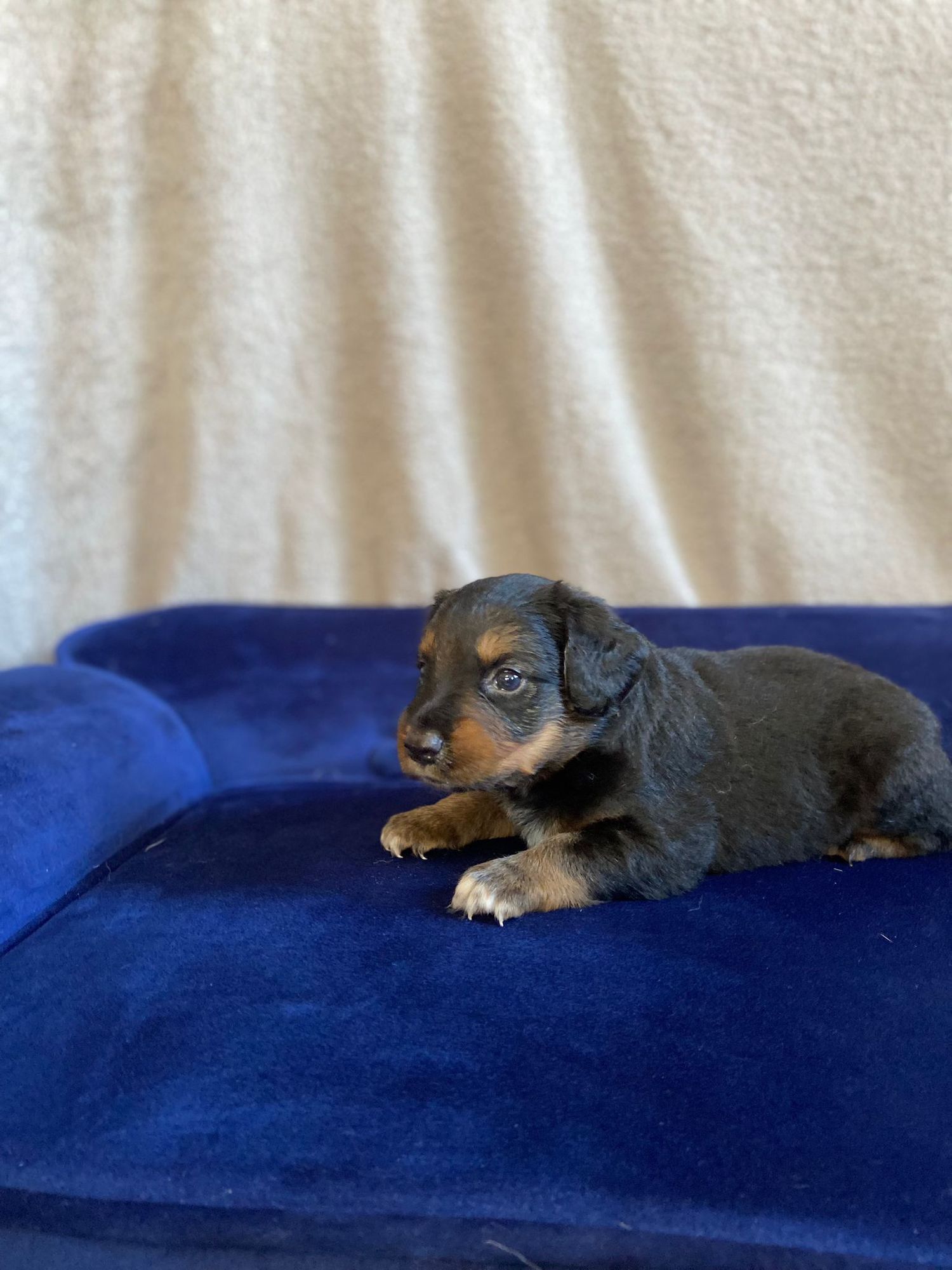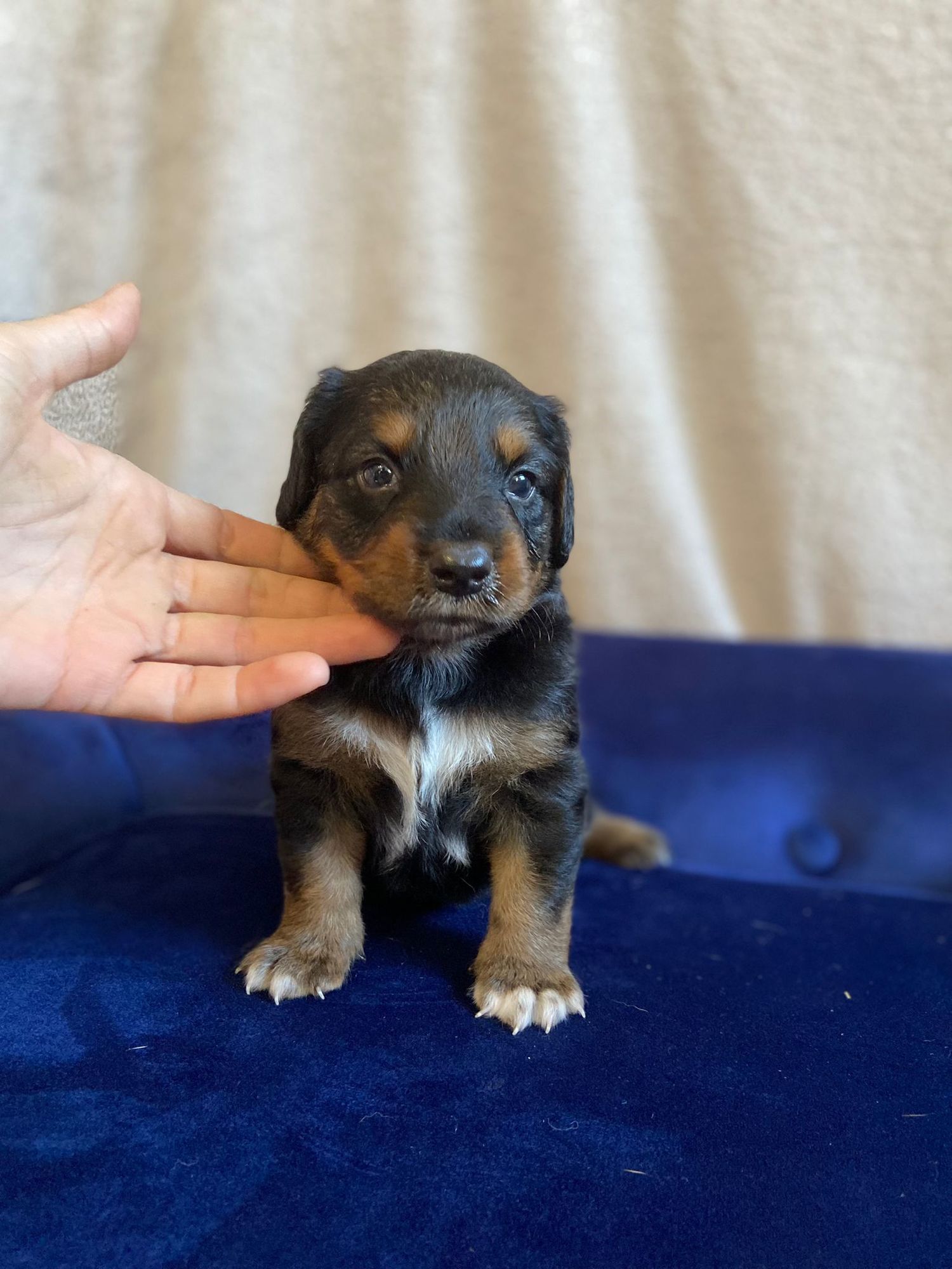 Indigo je roztomilý fešák v černé barvě s hnědým pálením a bílými tlapičkami. Více o štěňátkách sdělíme budoucím zájemcům později. Štěňátka jsou ještě velmi malá na to, abychom odhadli povahu.