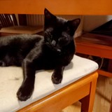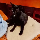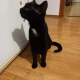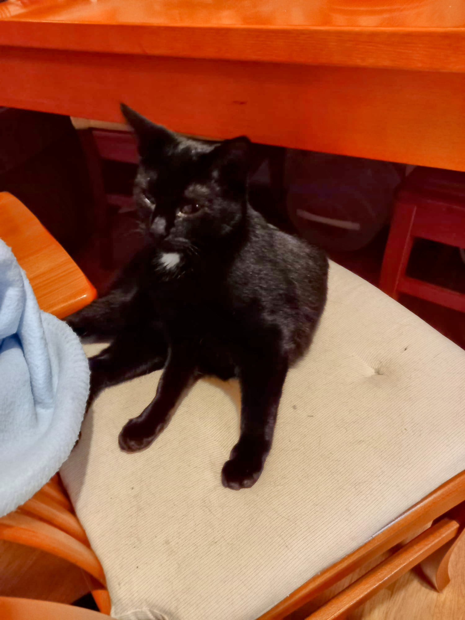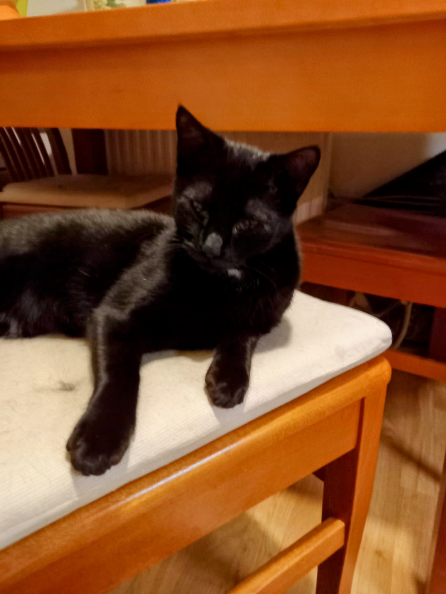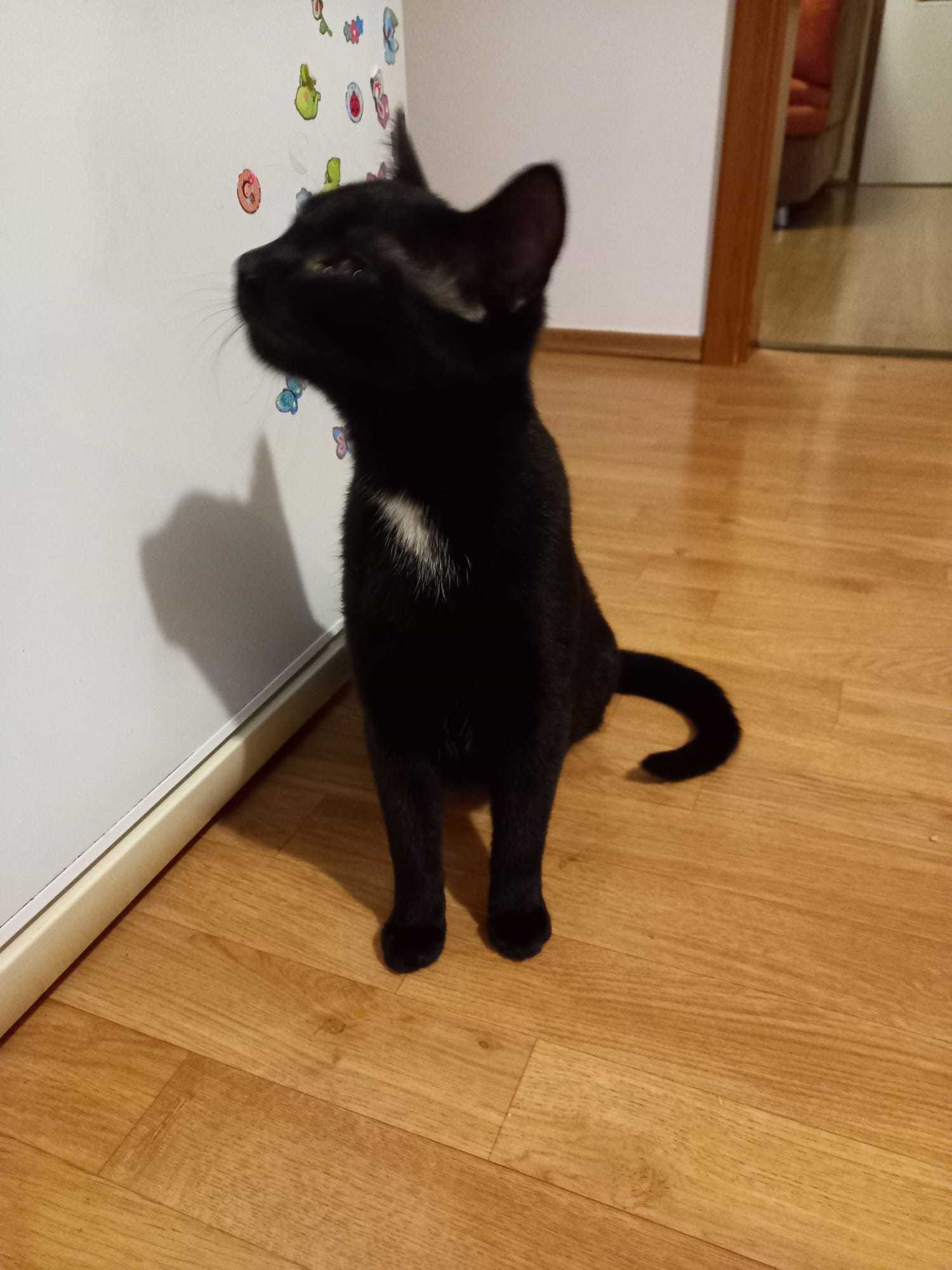 Tohle je prostě pravá čarodejnická kočka. Krásná, se špičatou bradičkou a lícními kostmi, má tak trochu arogantní výraz, srst jak uhel a bílou náprsenku a bříško. Tohle je prostě dokonalá magická kočka. Při příjmu vážila, 1,5kg, ale už se krásně spravila. Je to však plašánek, vhodná jako myšilov.