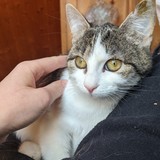Hubený a plachý kocourek, který se zatím hodně schovává. Když si ho dočaskářka chytí, nechá se drbat na zadečku... Vrčí, ale...