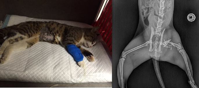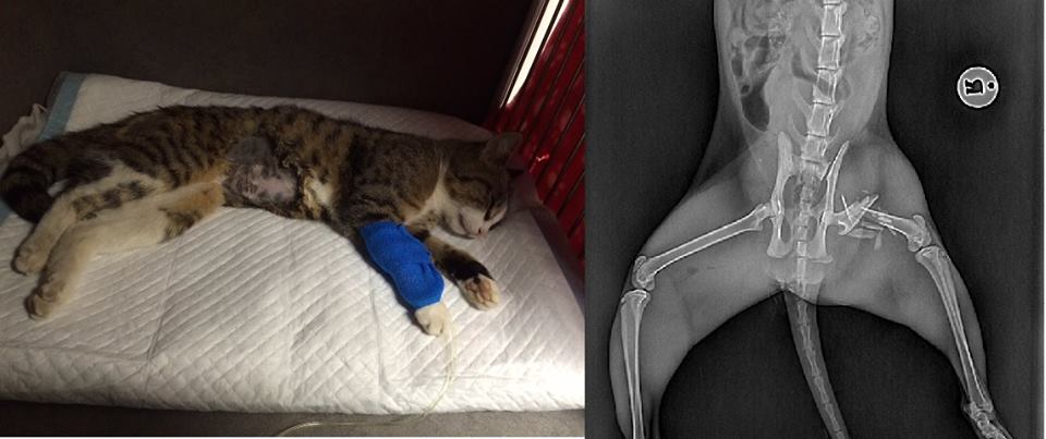 Má poraněné plíce, zlomenou pánev, roztříštěnou stehenní kost a šokový stav. Plíce by se měly dle veterinářů zahojit, pánev také, ale pánevní končetina již zachránit nepůjde, a tak bude nutné ji amputovat. Kočička má v sobě silná analgetika, antibiotika, je uspaná. a po stabilizaci stavu ji čeká operace.