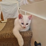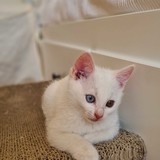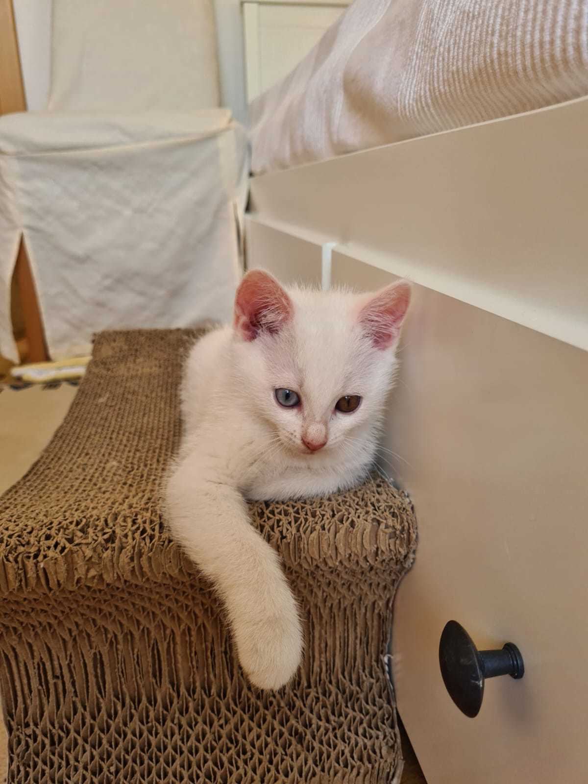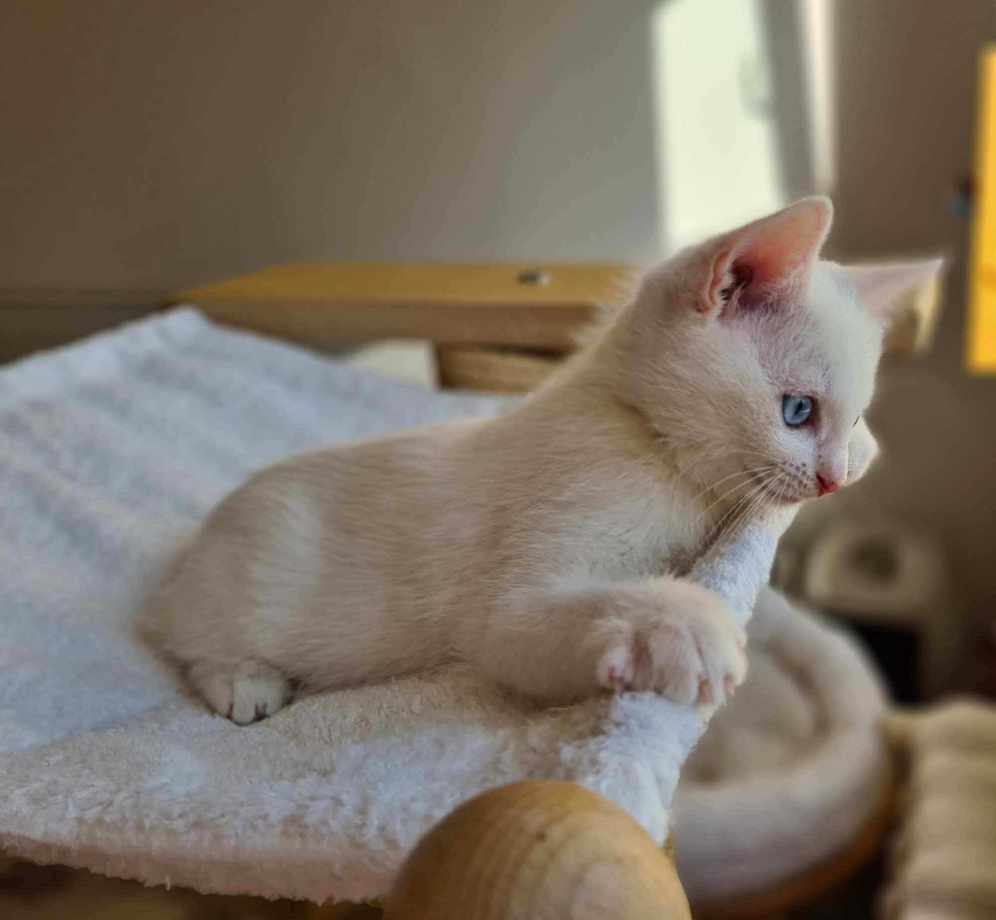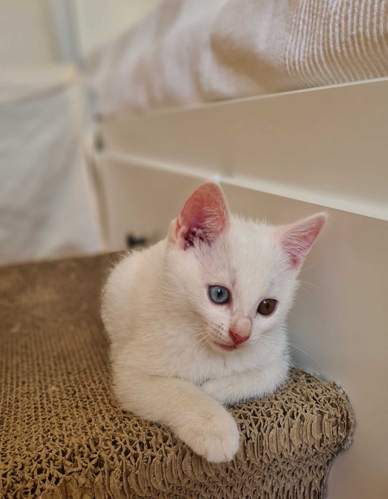 Mia, je různooká kočička. Jedná se o heterochromii. Je to velmi krásné a unikátní ✨ Ač vypadá jako andílek, je pěkné torpédo. Nic nenechá na pokoji a všechno jí zajímá. Bohužel nic neslyší a proto může žít pouze v bytě. Její hendikep ji nijak neomezuje.