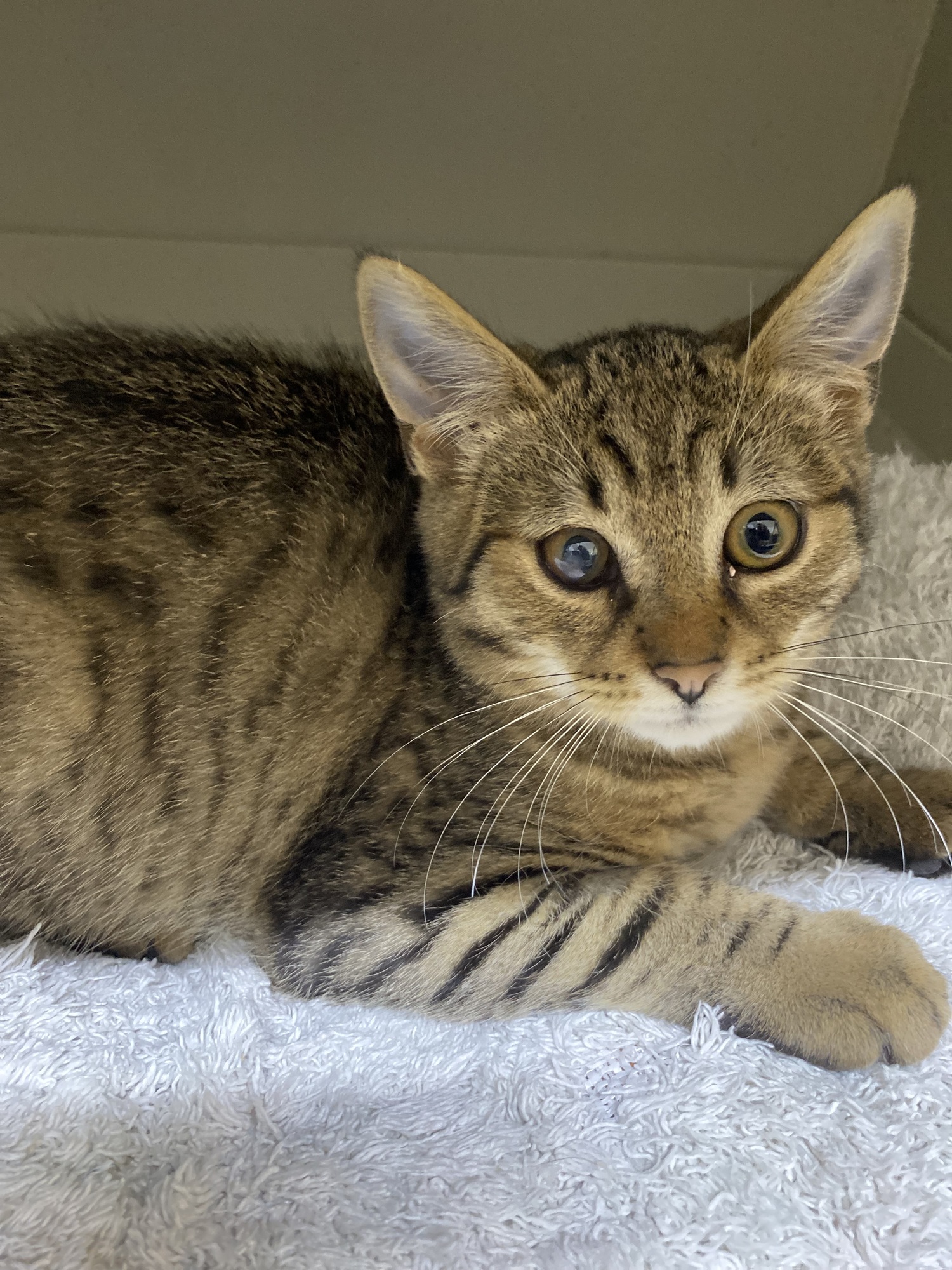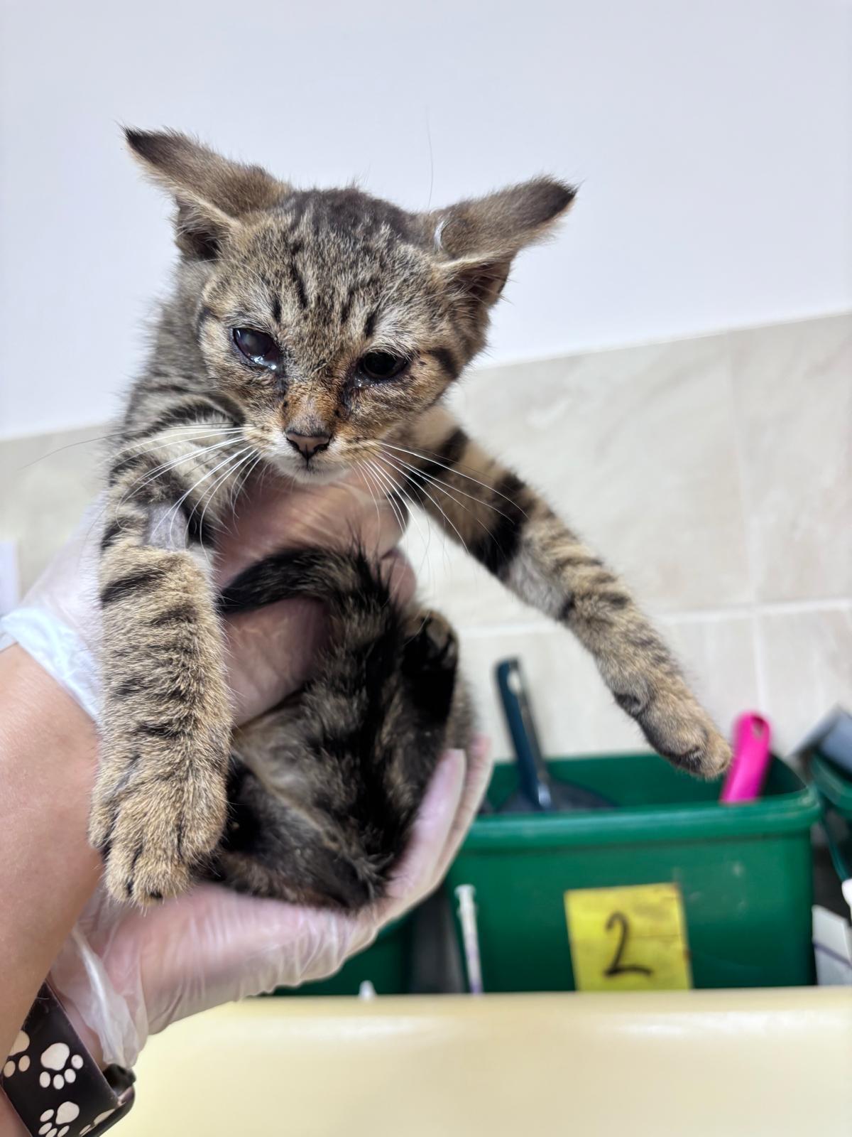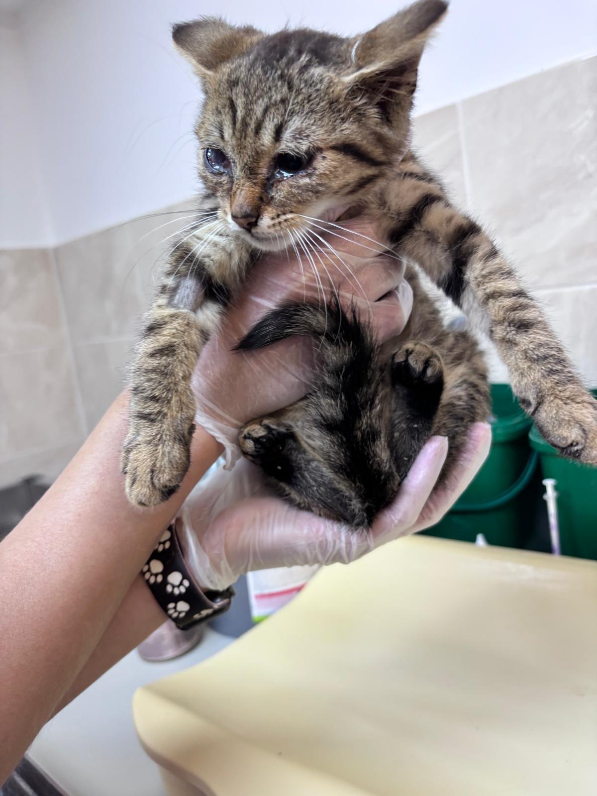 Koťátko léčíme na infekční onemocení očí, oko se z dá již takřka v pořádku a Yasminka čeká vakcinace. Je to velmi komunikativní a milý kocourek.