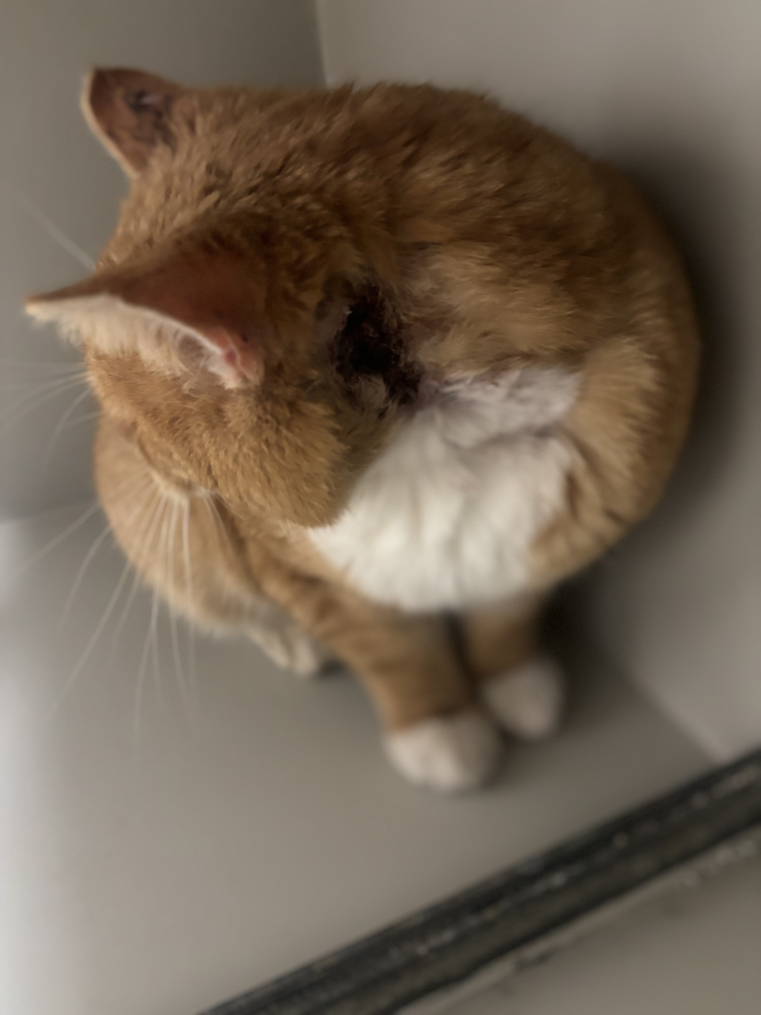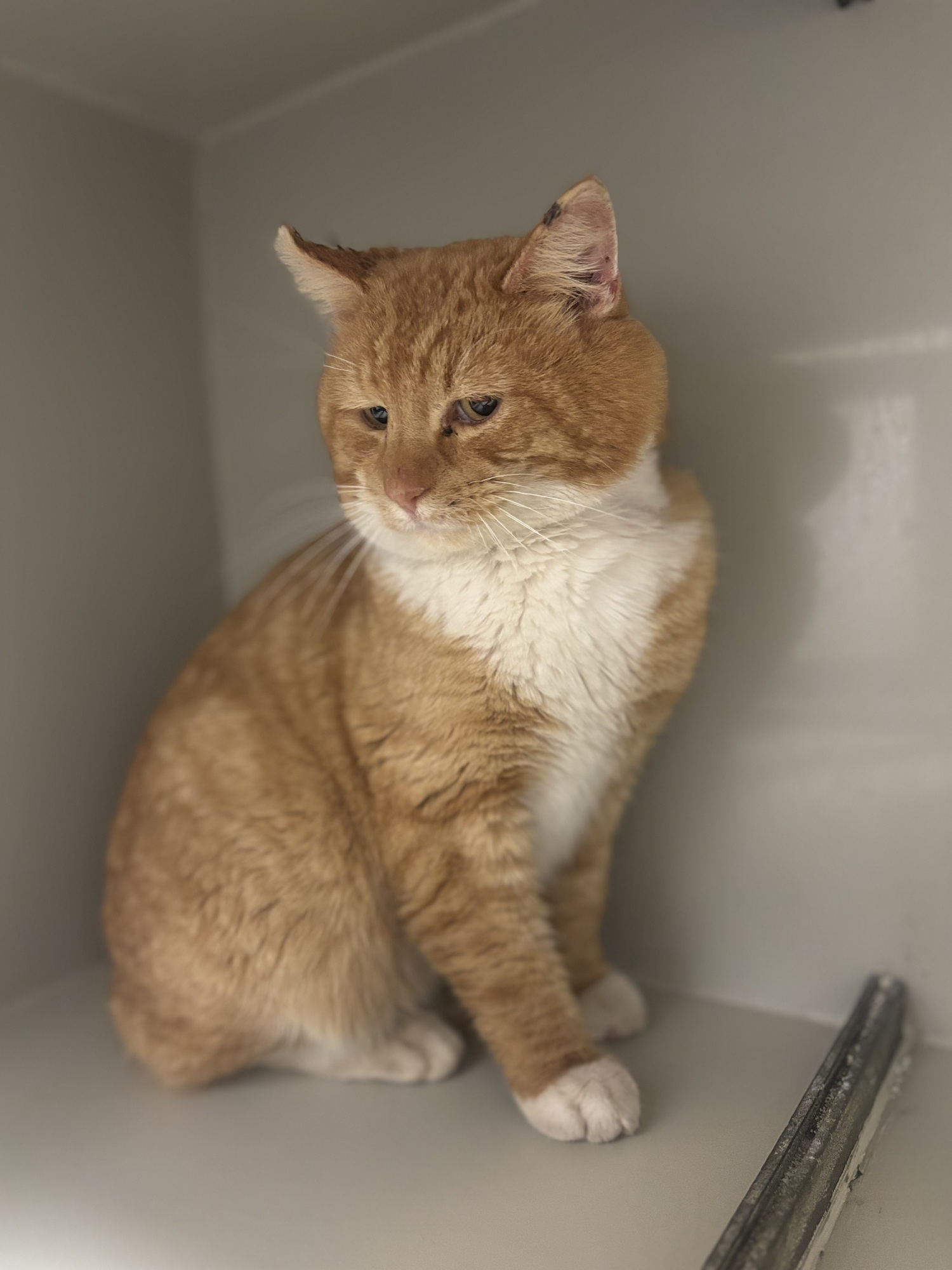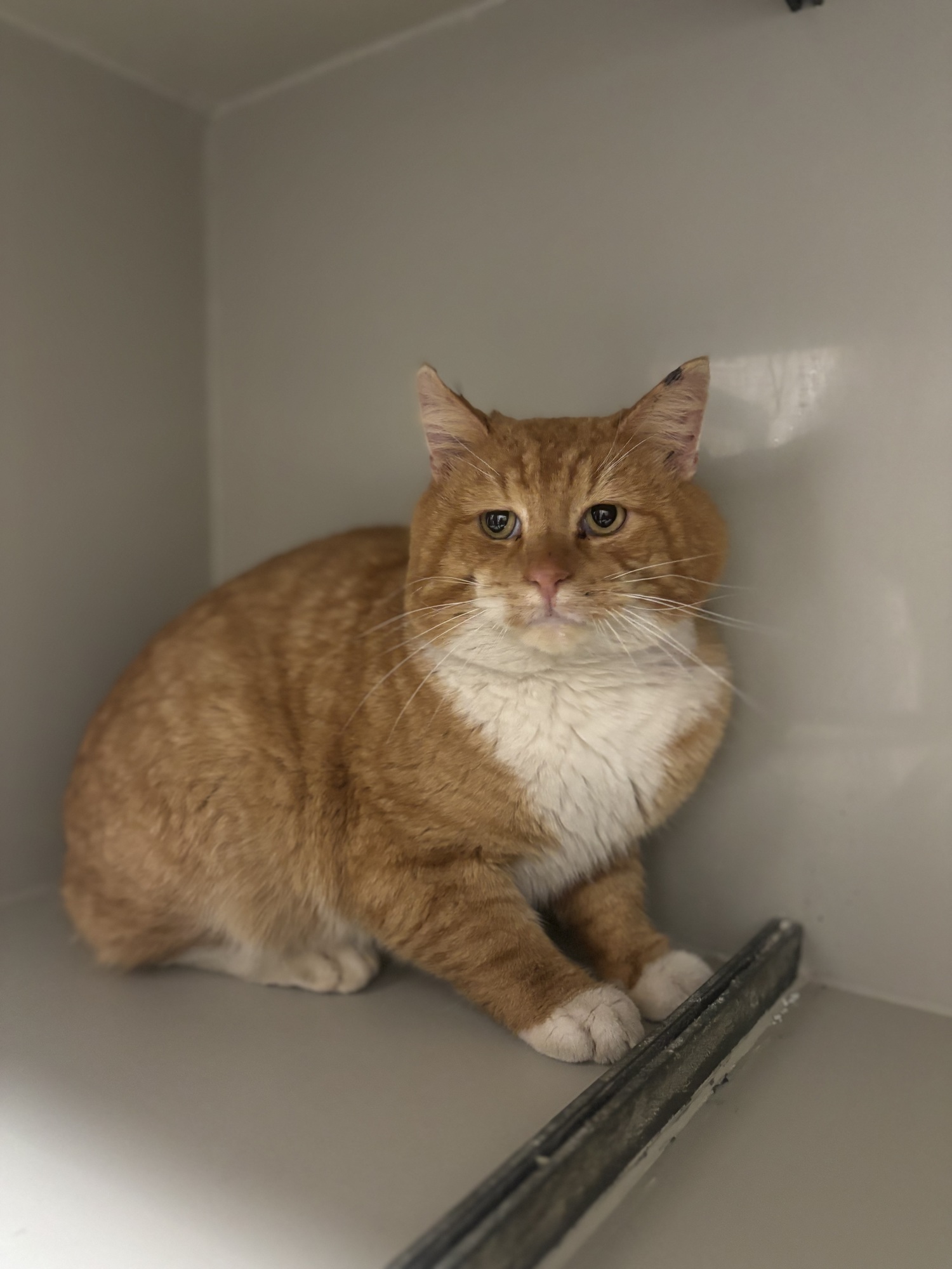 Veliký pěkný kocour, přivezla ho MP z Jablonného. Paní, která ho krmila, si všimla, že je zraněný. Má starší rány za ušima, nejspíše po boji s jinou kočkou. Čeká ho veterina. Je opatrný, ale pohladit se nechá.
