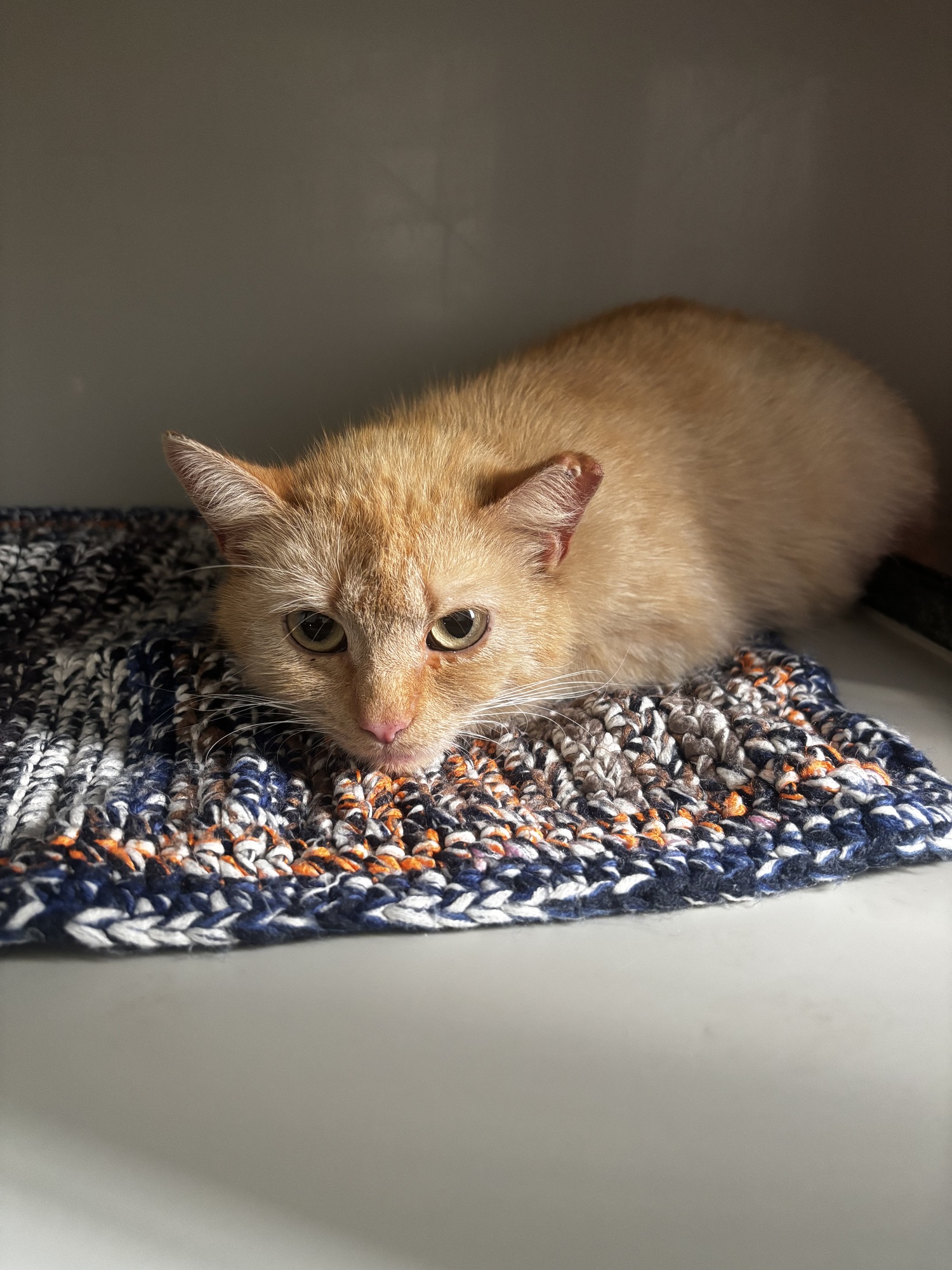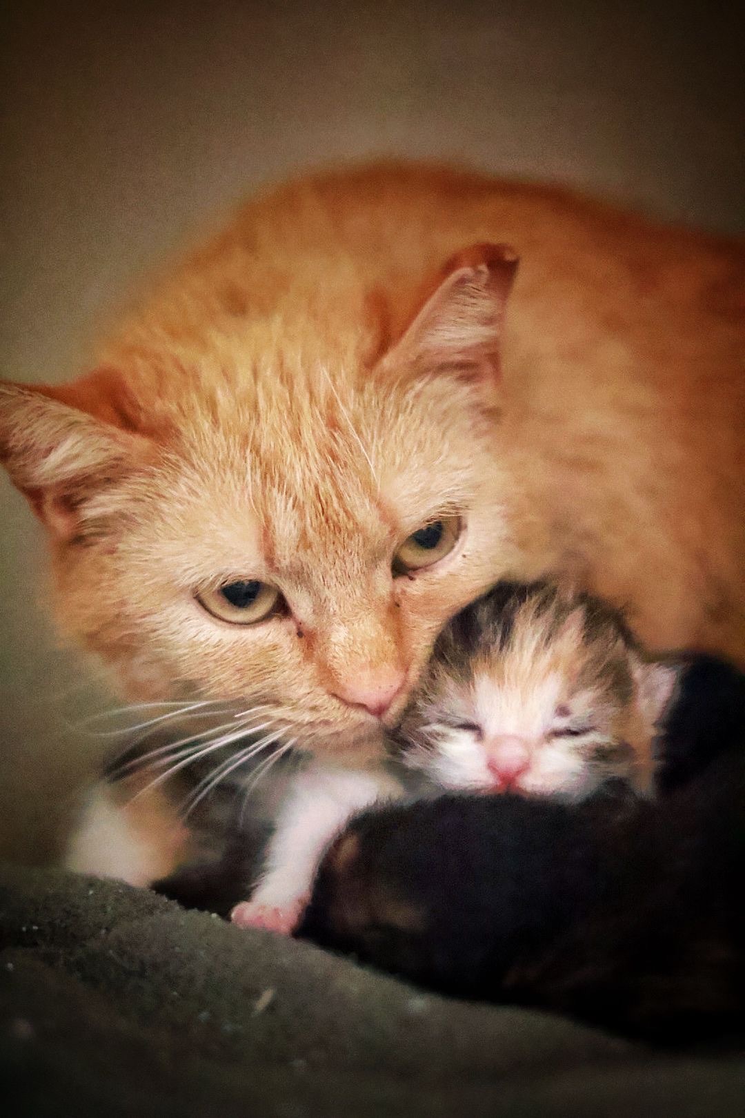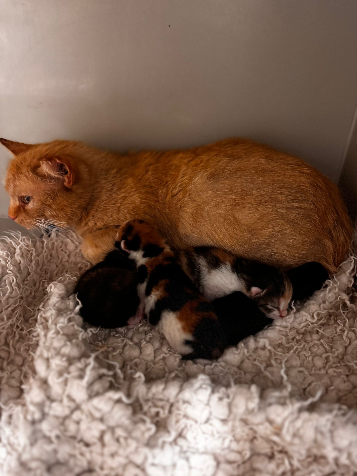 Ginger k nám přivezli nálezci s tím, že je pravděpodobně březí. Potulovala se delší dobu okolo firmy v Jablonci, nakonec ji chytili a přivezli k nám. Bylo to za 5 minut 12, pac hnedka druhý den po příjmu, porodila krásná koťátka.