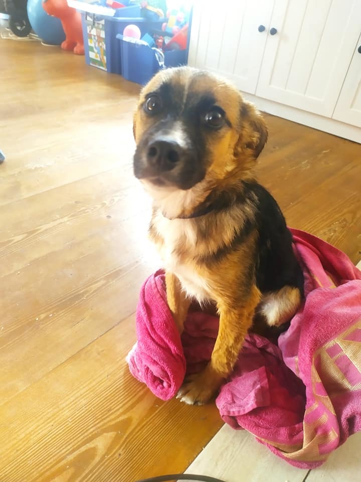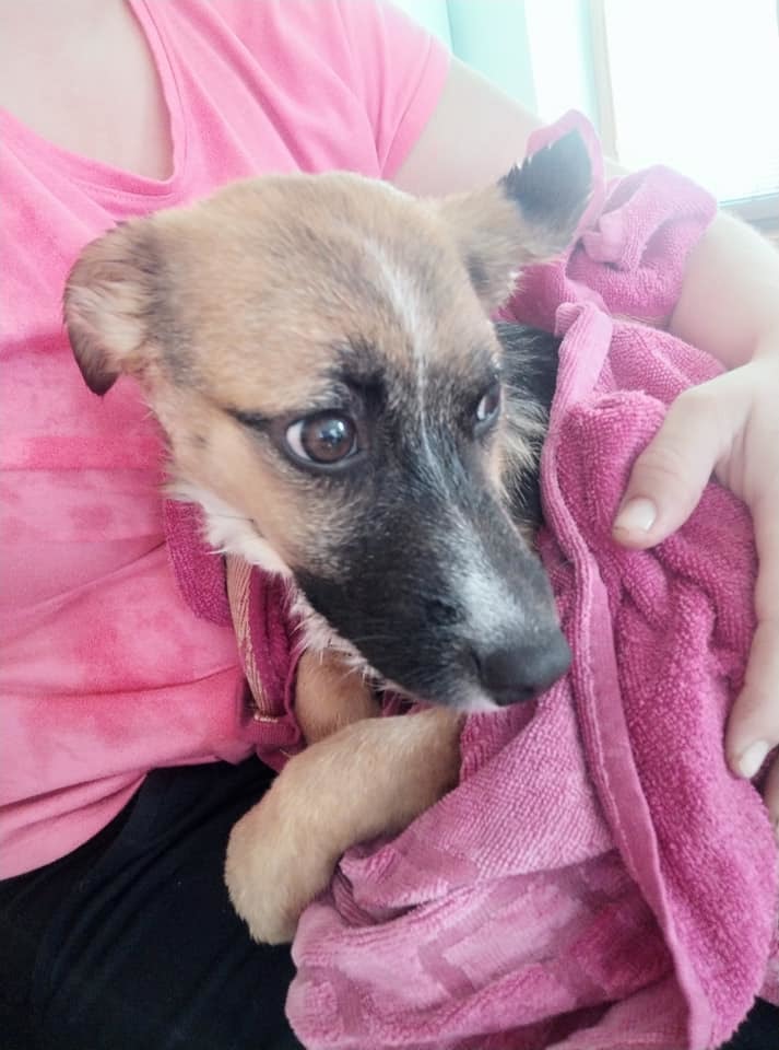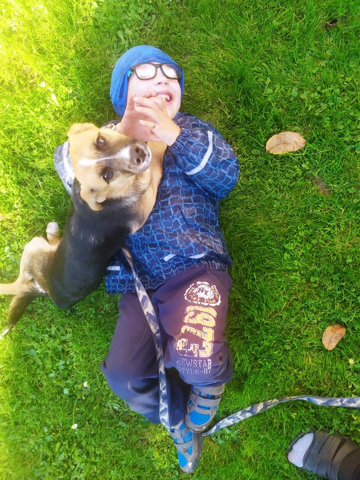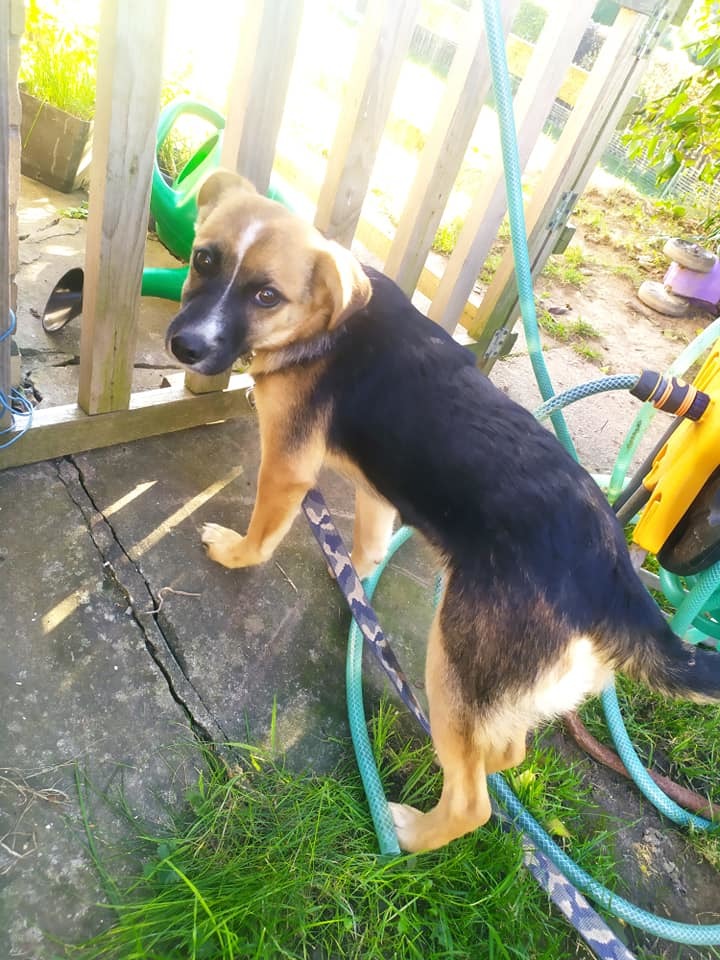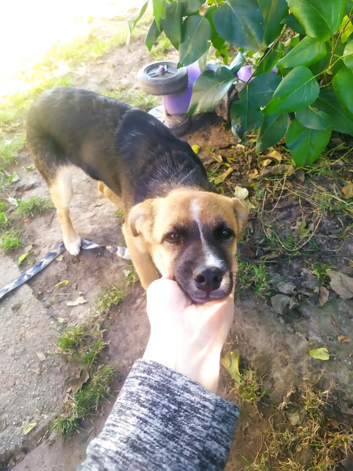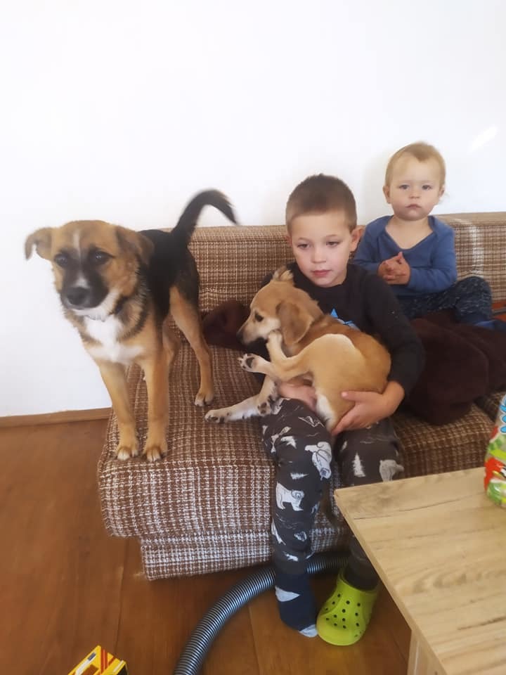 Bourák cca 4 měsíční menší kříženeček. Je zatím bojácnější, ale zvyklý na smečku psů a má rád děti.