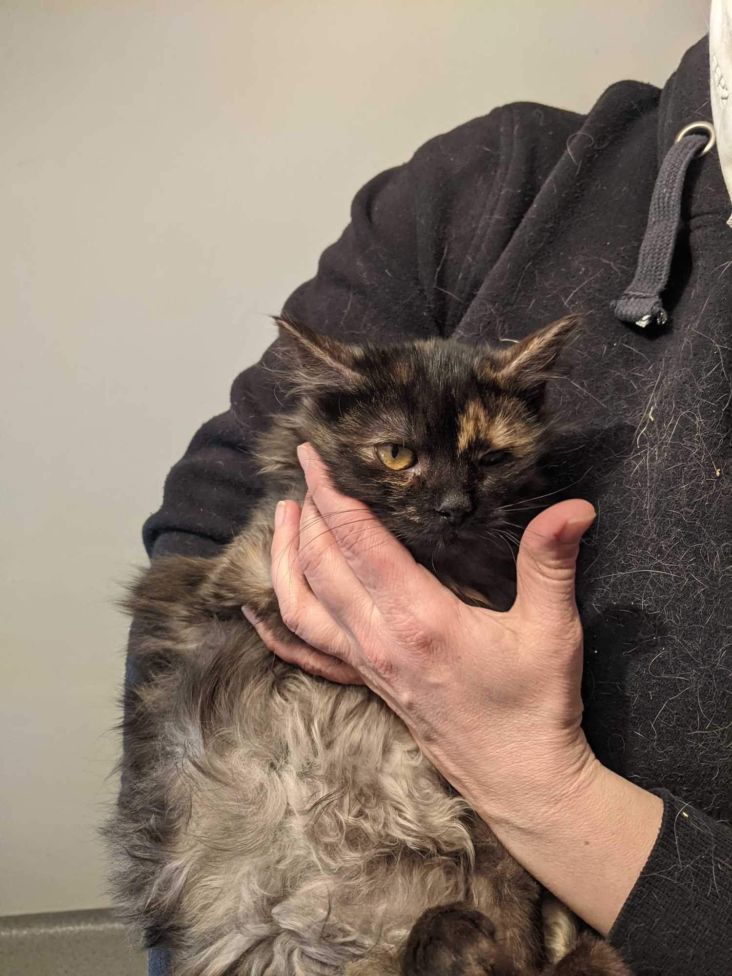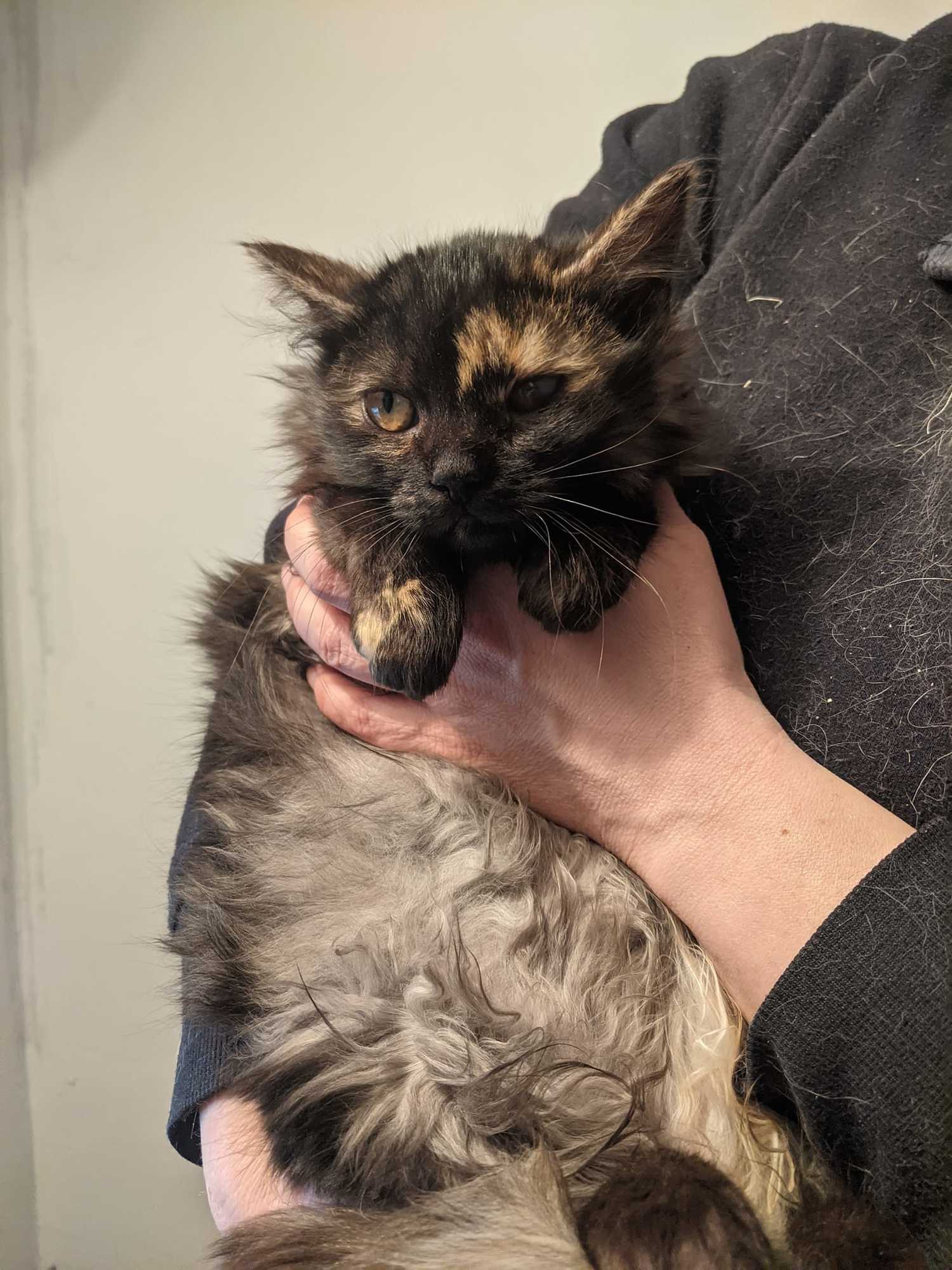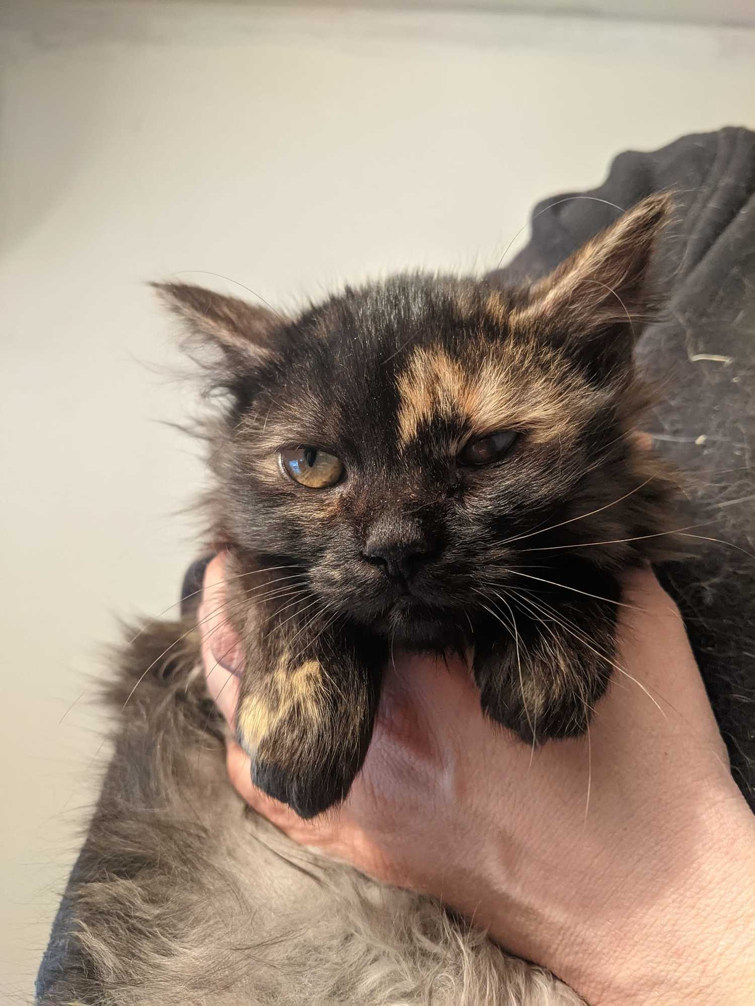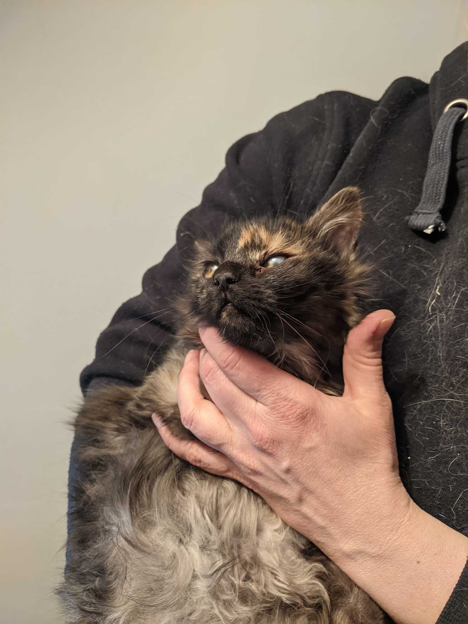Ronja je kotě přijaté z kolonie v Železném Brodě, kde se přemnožily kočky a přežívaly jen díky krmičce. Jako ostatní přišla zanudlená a se zánětem očí. Po atb je jí lépe, kapeme jí také oči Tobrexem. Už se nebojí, nechá se pochovat, psychicky je na tom již lépe.. Momentálně má zašité očko kvůli léčbě vředu.