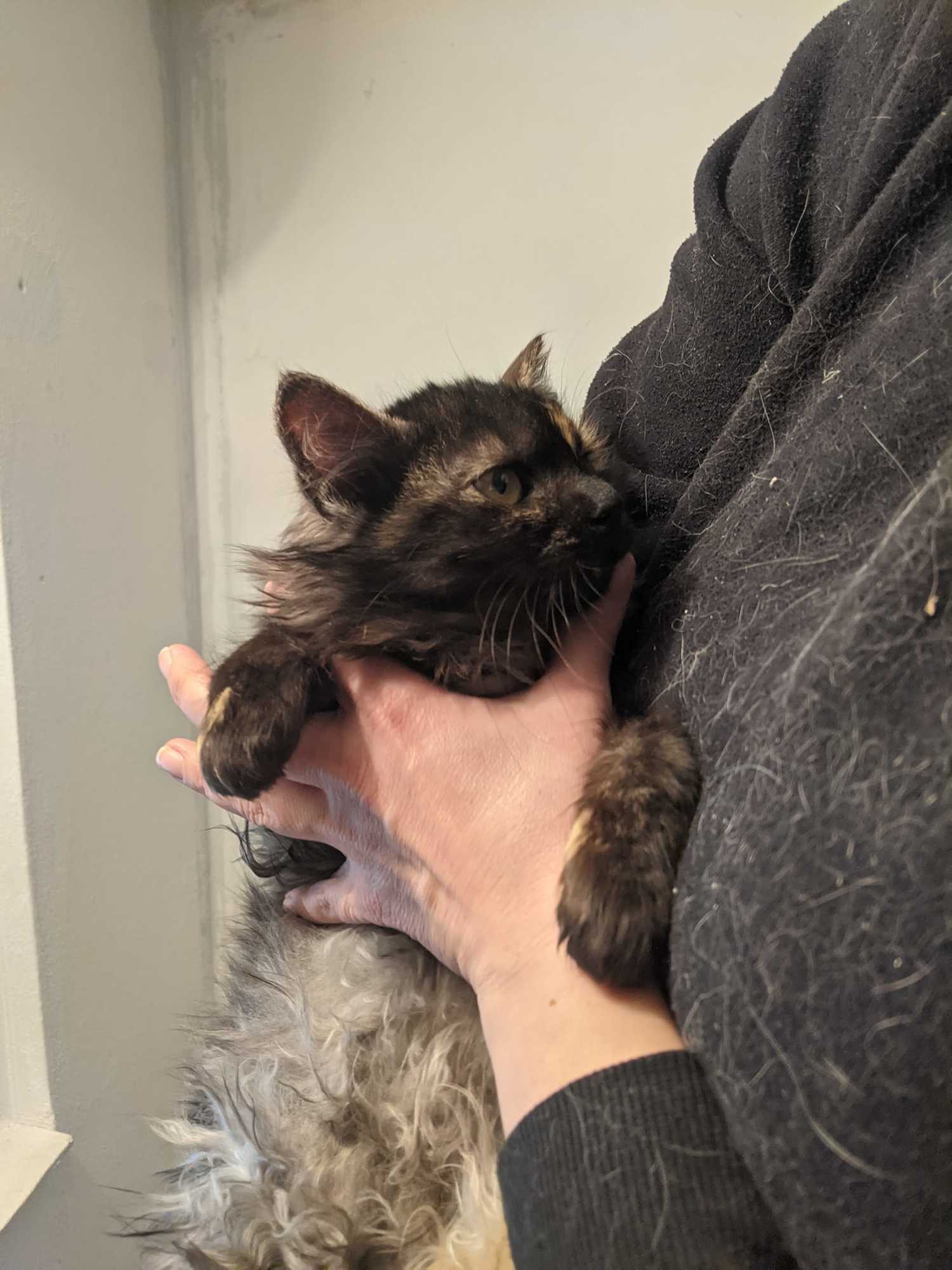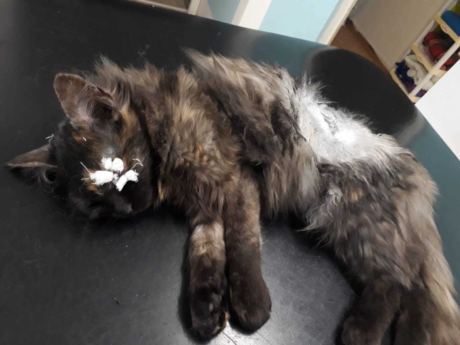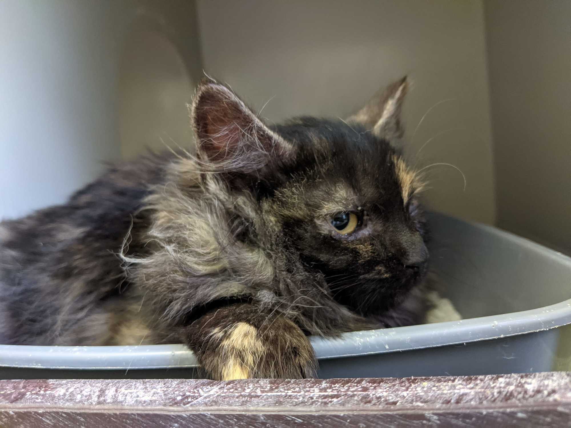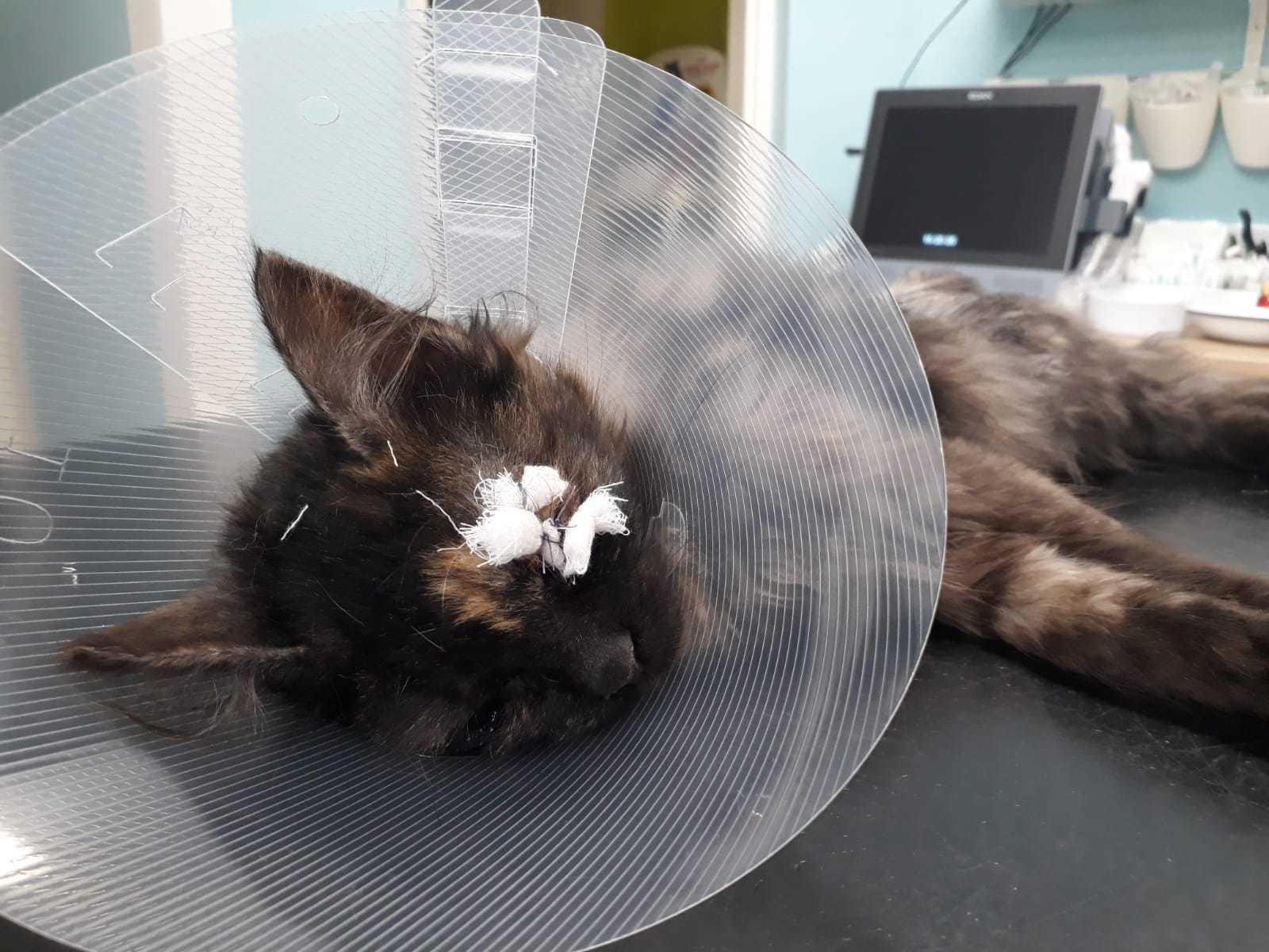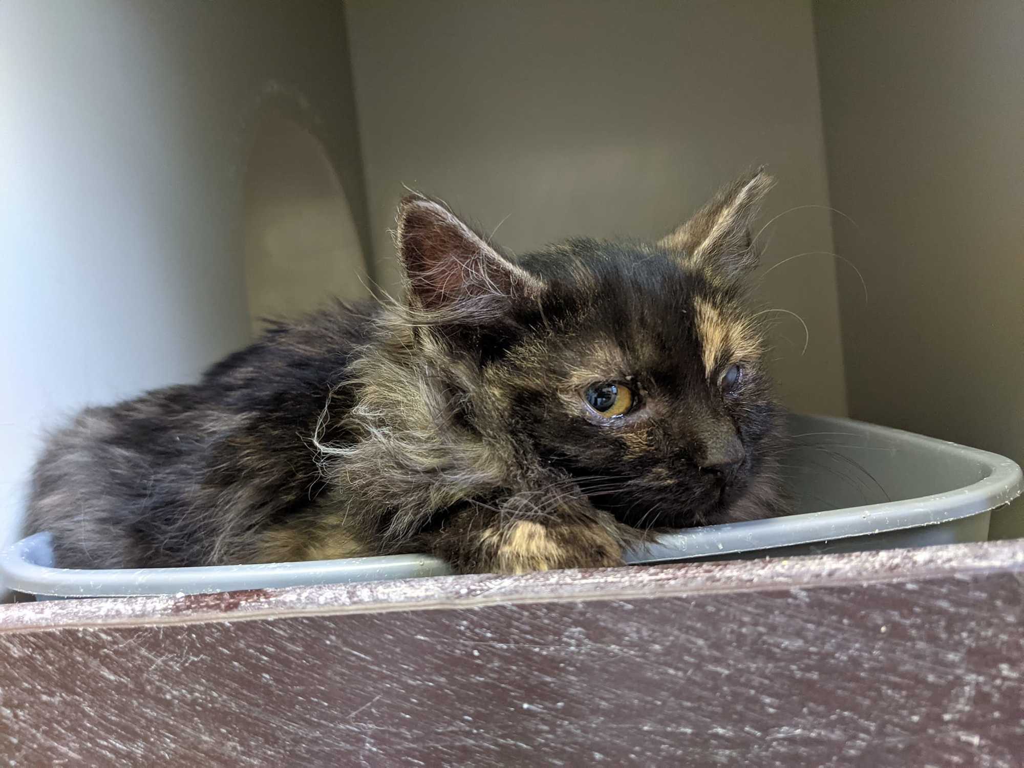 Ronja je kotě přijaté z kolonie v Železném Brodě, kde se přemnožily kočky a přežívaly jen díky krmičce. Jako ostatní přišla zanudlená a se zánětem očí. Po atb je jí lépe, kapeme jí také oči Tobrexem. Už se nebojí, nechá se pochovat, psychicky je na tom již lépe.. Momentálně má zašité očko kvůli léčbě vředu.