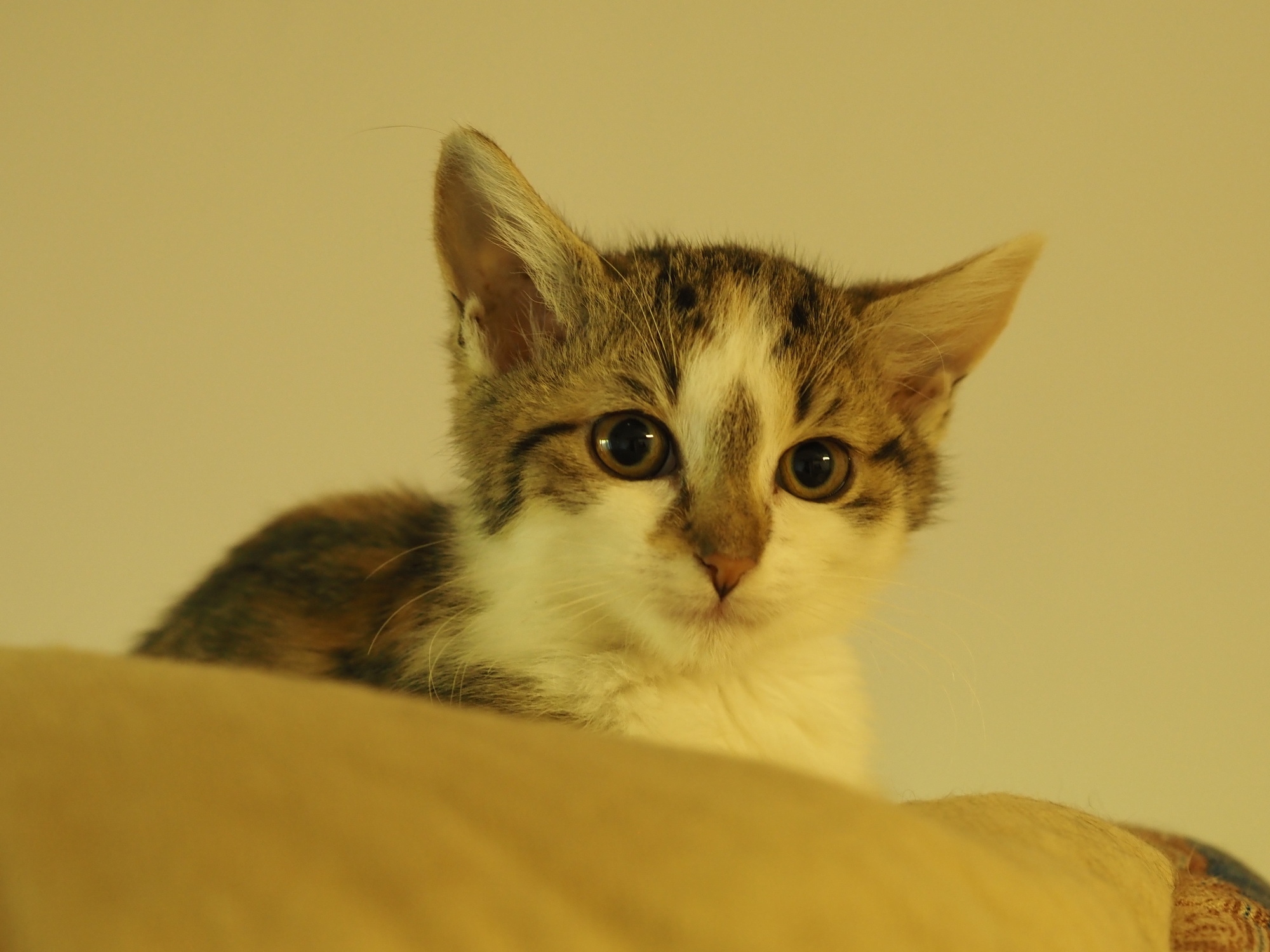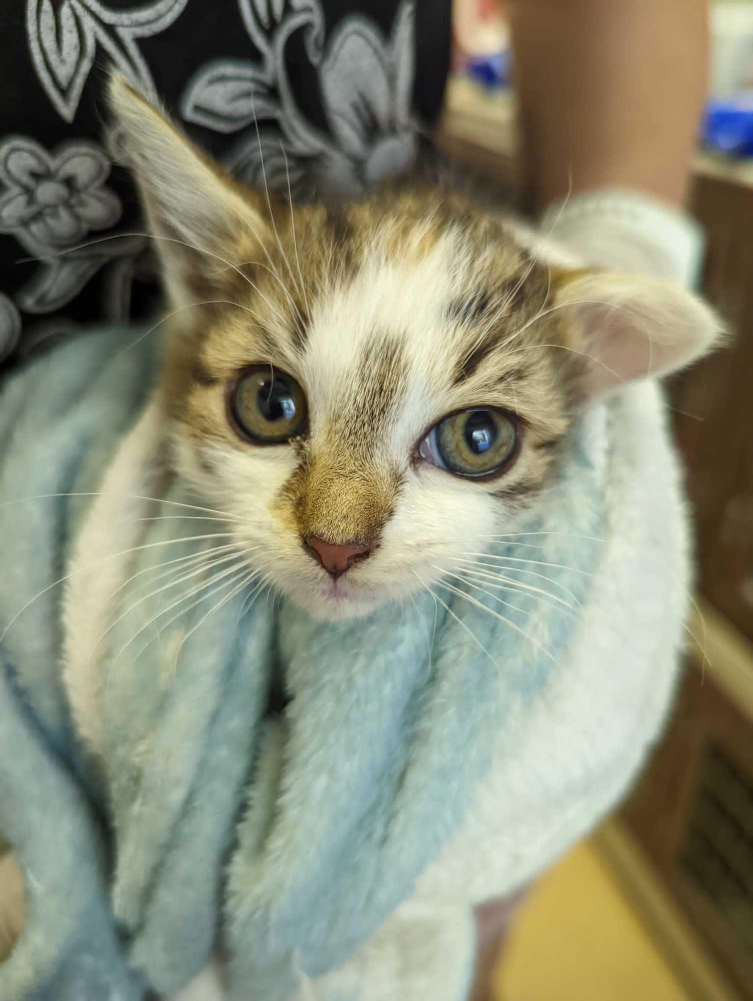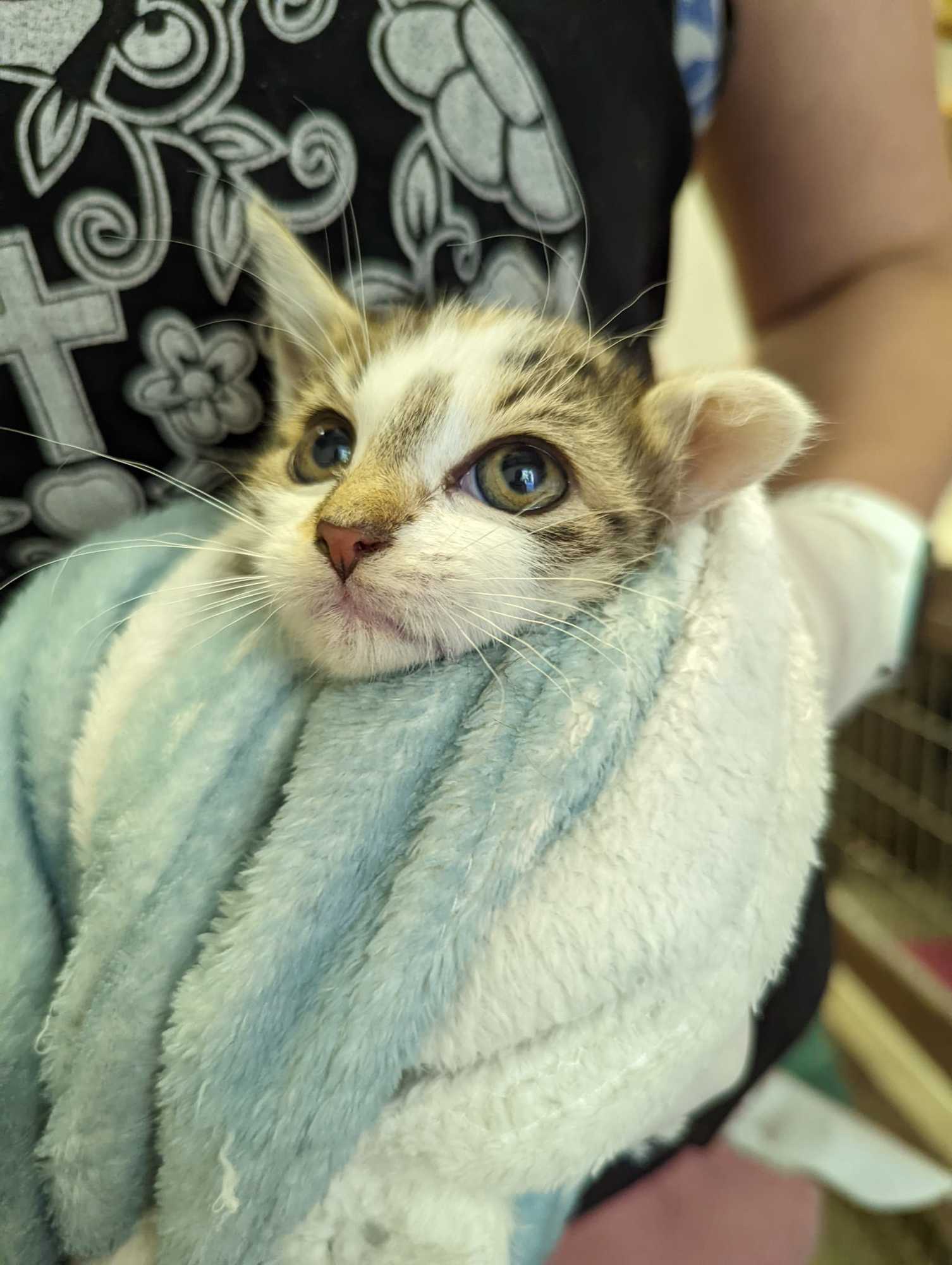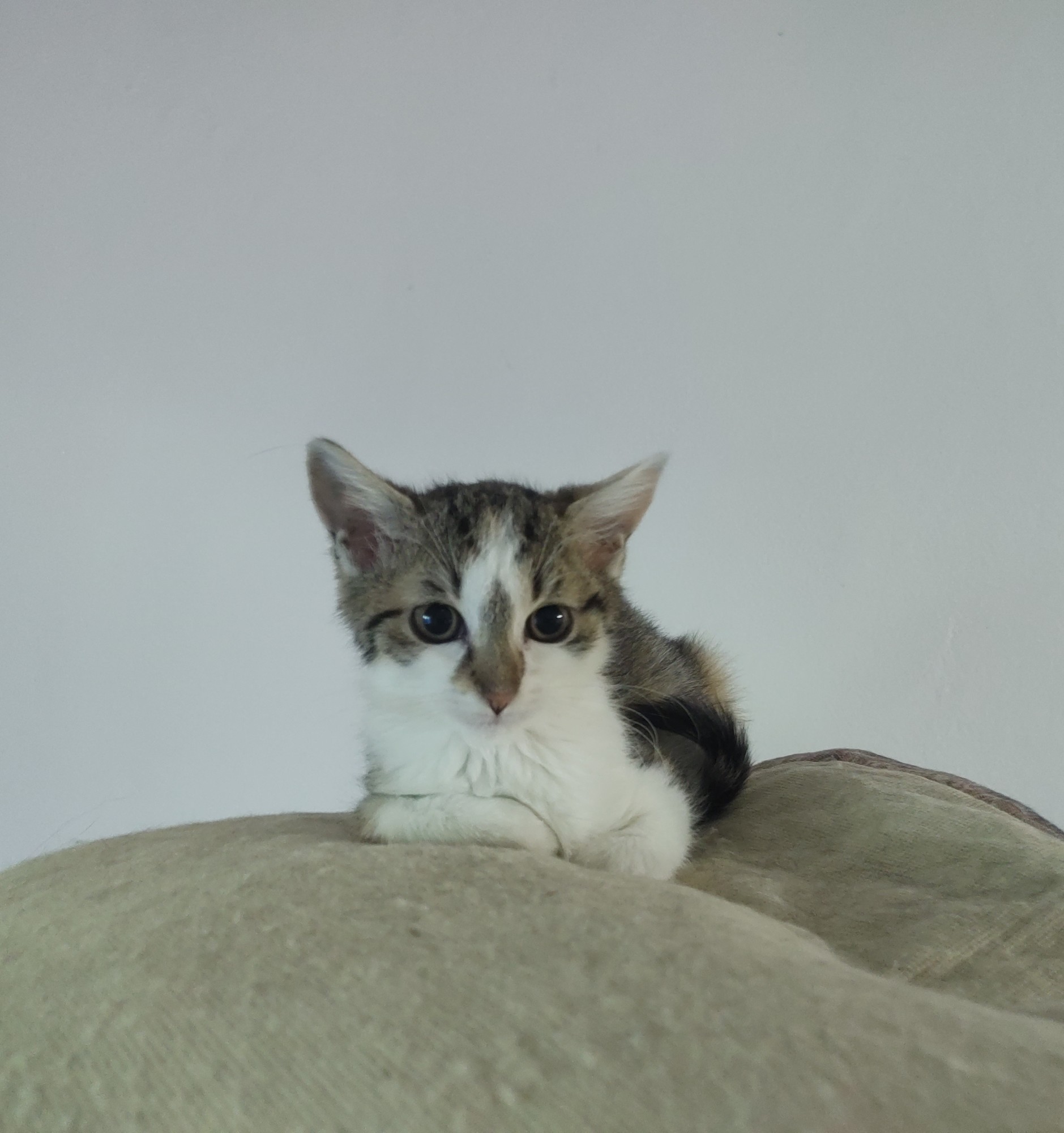 Pochází z liberecké sběrny kovů, kde se přemnožily kočky. Zprvu se boji, bude potřebovat dávku laskavosti a trpělivosti.