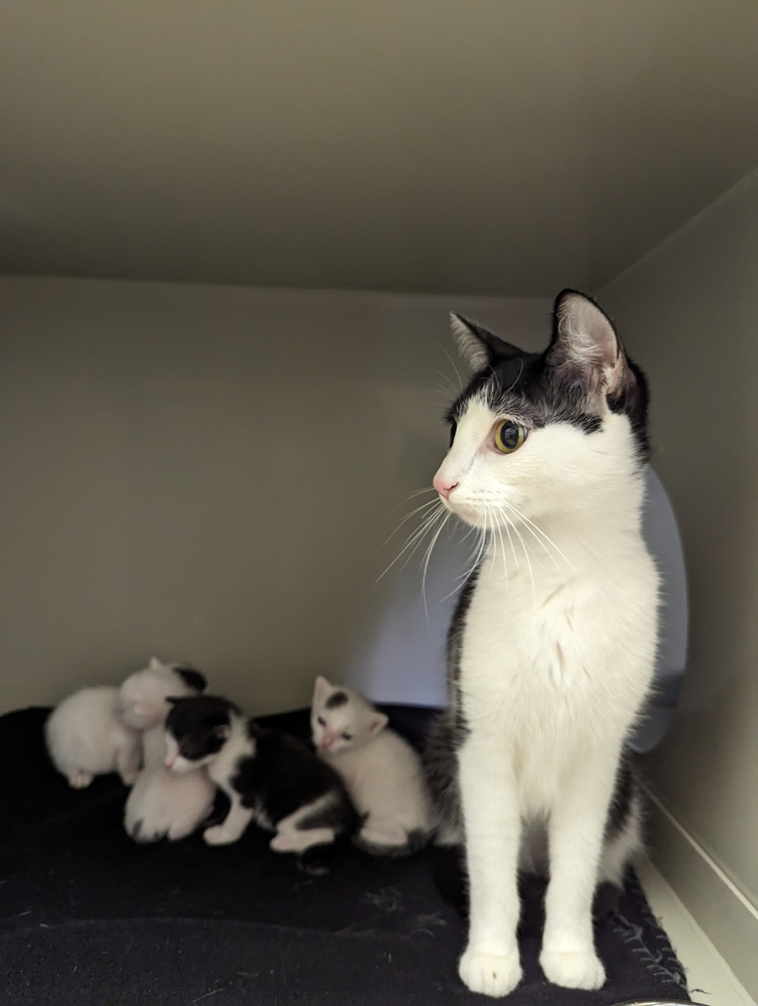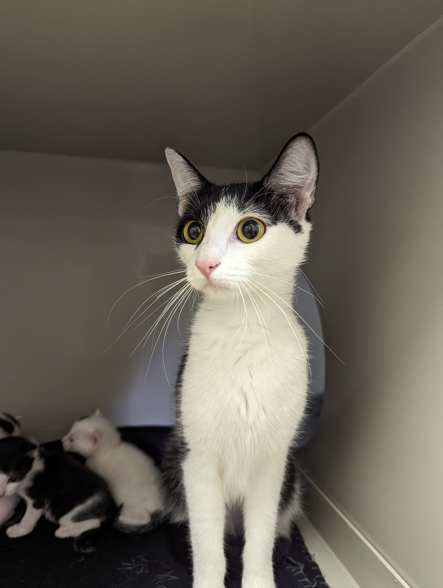 Médea je mazlivá kočička, která byla nalezena u popelnic se svými 4 cca čtrnáctidenními koťátky. V přepravce s nimi byl nejspíš i tatínek kotátek Oskar. Po odstavení koťátek čeká Medeu kastrace, očkování a hledání té nejlepší rodiny.