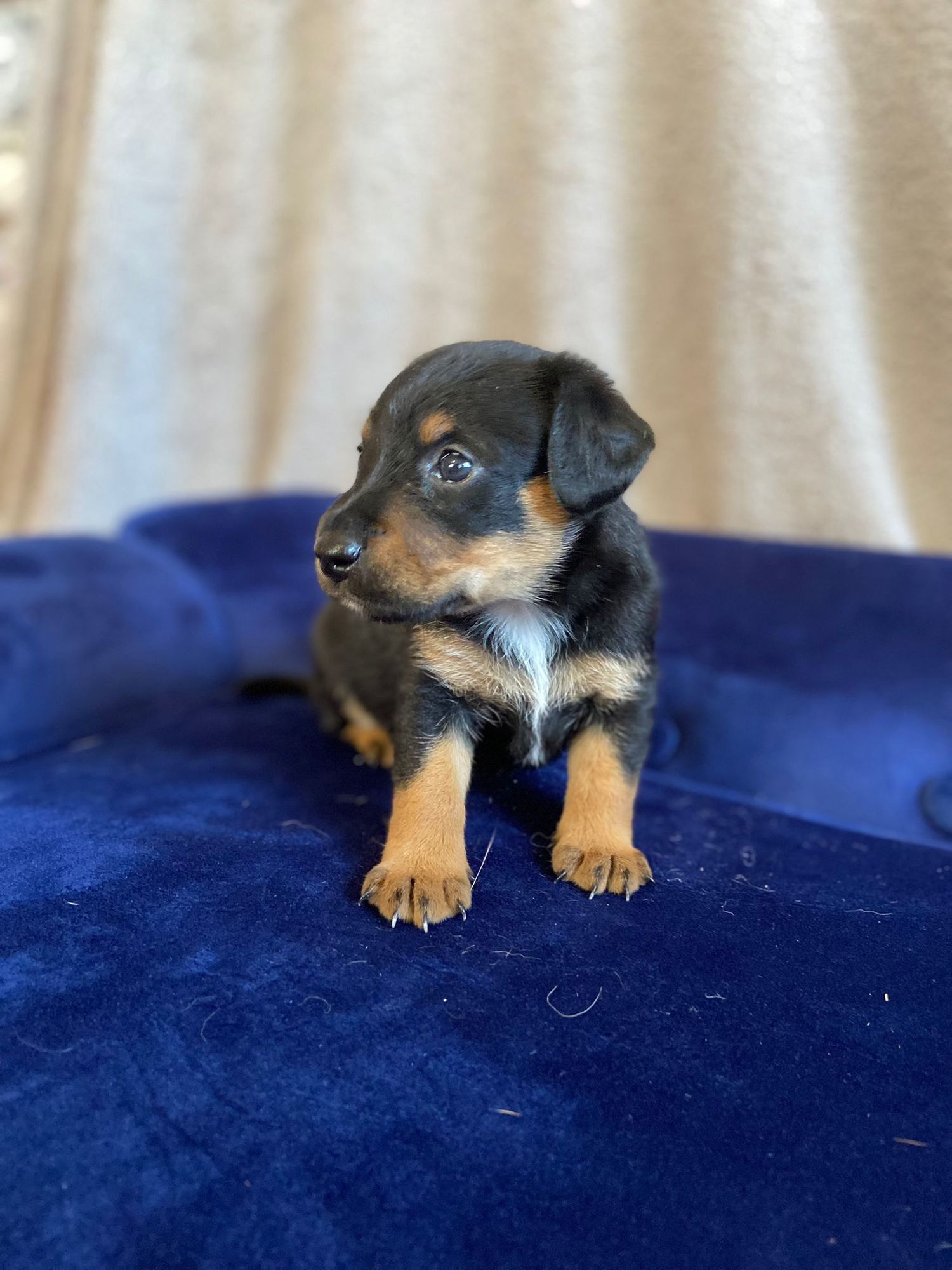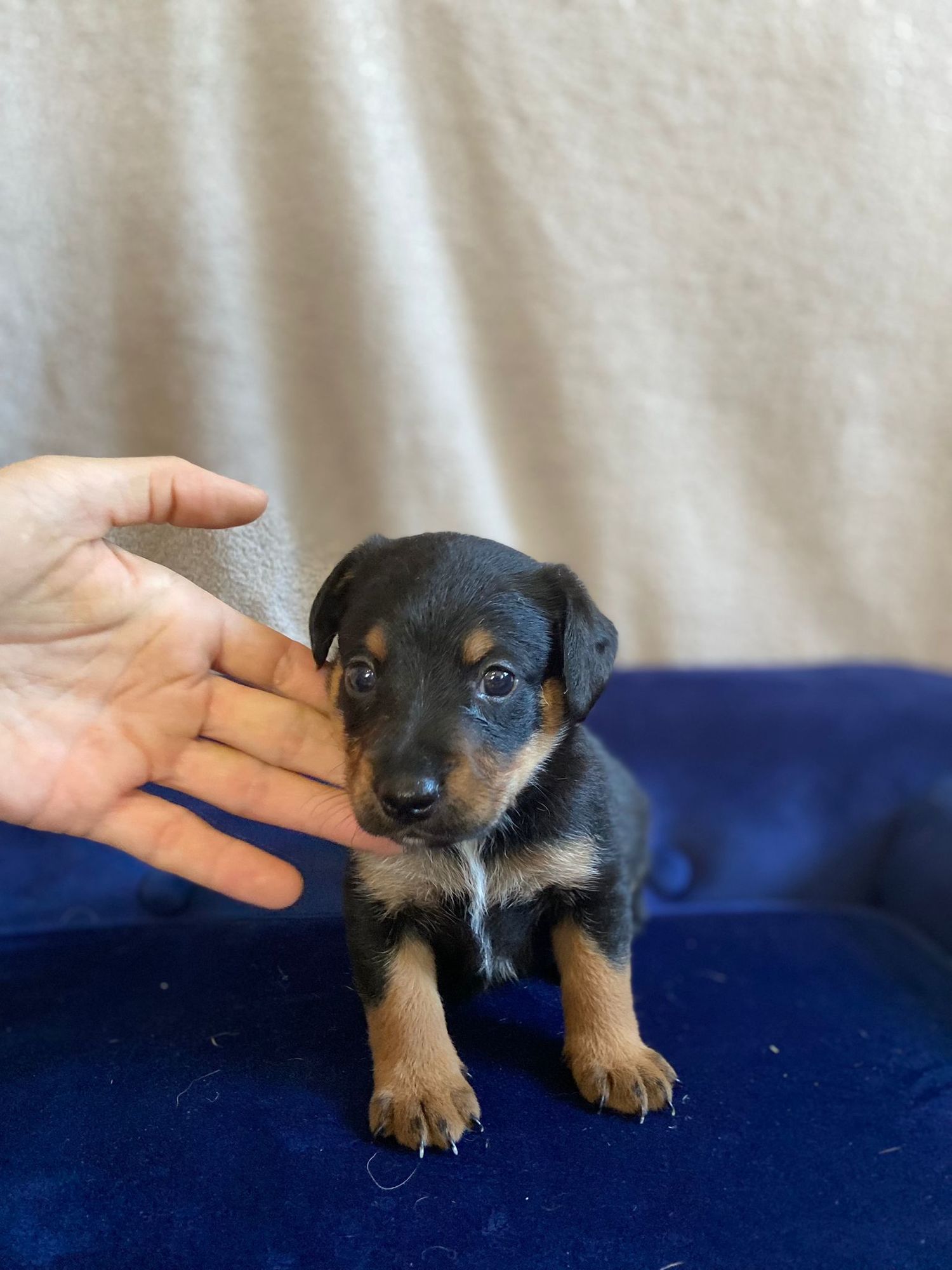Izzie je roztomilá holčička v černé barvě s hnědým pálením a bílou náprsenkou. Je nejmenší z celého vrhu. Více o štěňátkách sdělíme budoucím zájemcům později. Štěňátka jsou ještě velmi malá na to, abychom odhadli povahu.