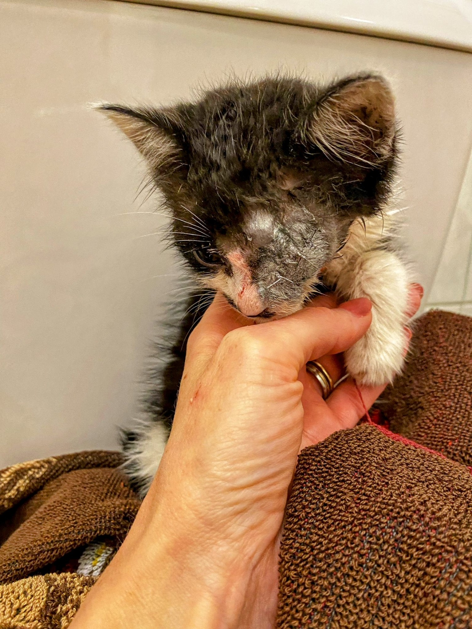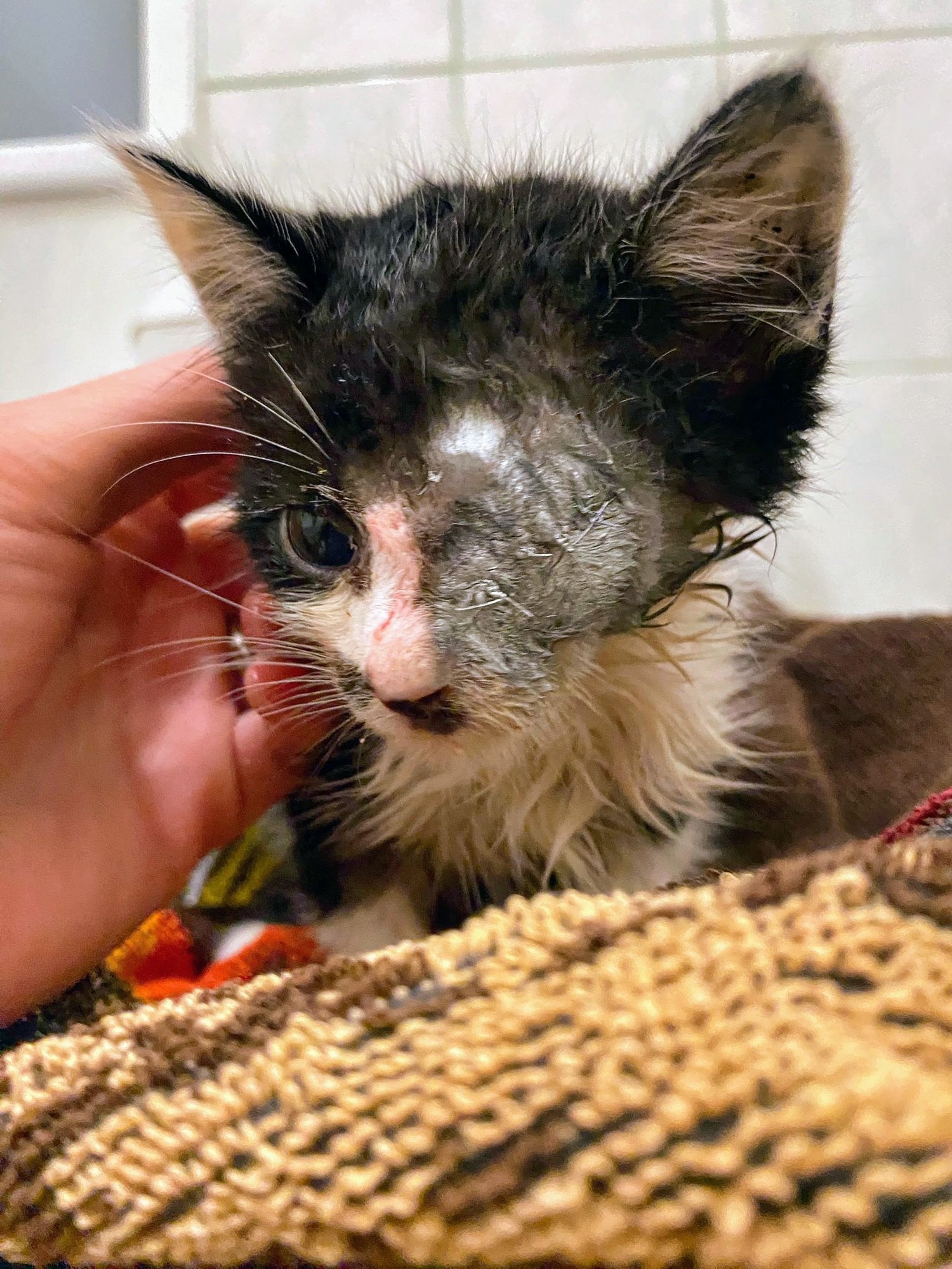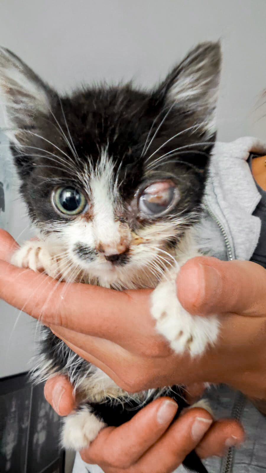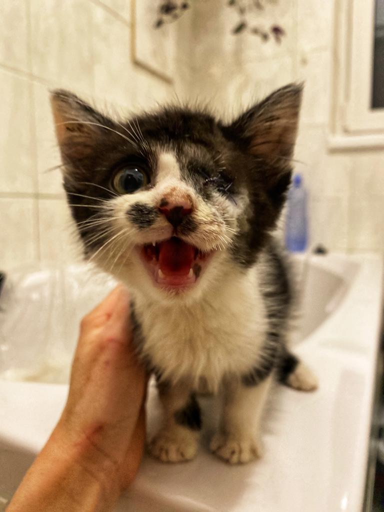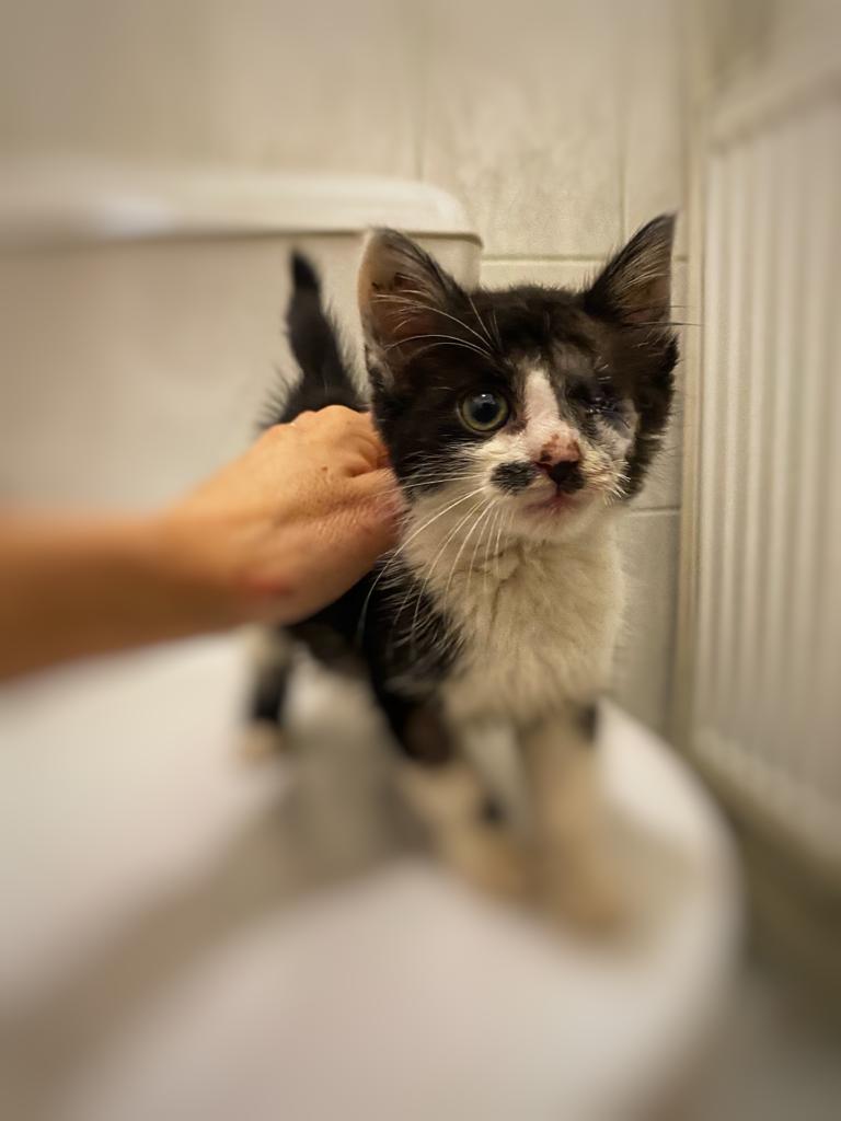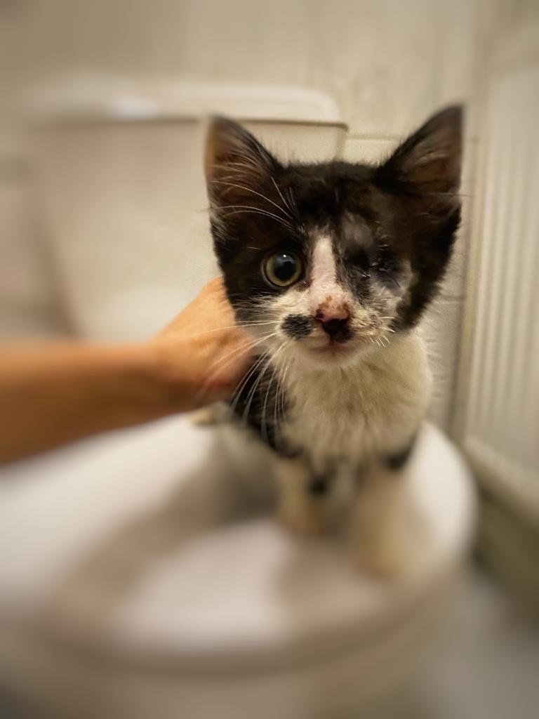 Maličký kocourek musel podstoupit operaci, protože očičko postižené zánětem mu prasklo. Zákrok zvládnul dobře. Bohužel momentálně bojujeme s vyprazdňováním. Peristaltika střev se vlivem narkozy spomalila a i předtím měl vyboulený konečník kvůli zácpě z dehydratace. Bere však léky a stav se pomalu zlepšuje.
