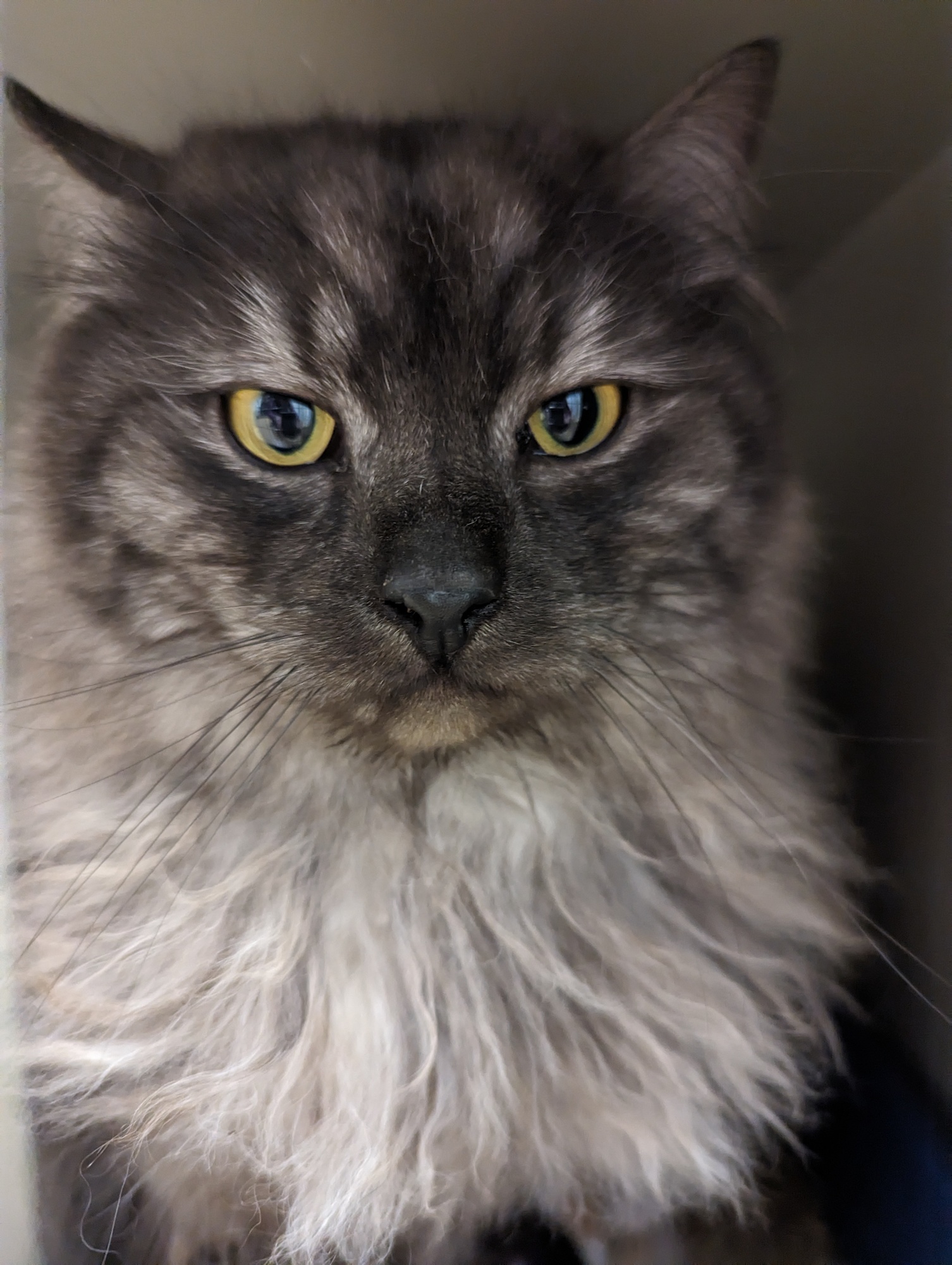 Nádherná kočička, možná kříženec MCO. Zprvu opatrná, ale mazlivá a milá. Zvyklá na Rozinku, se kterou přijela.