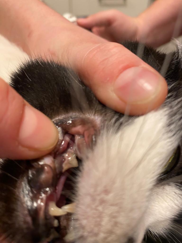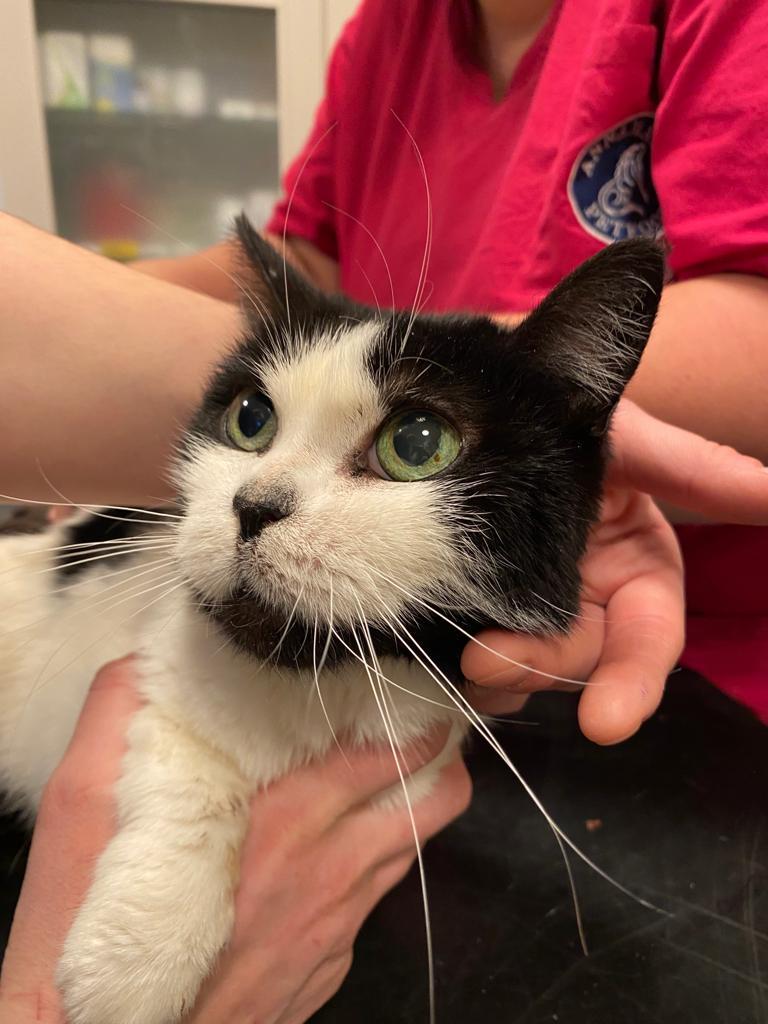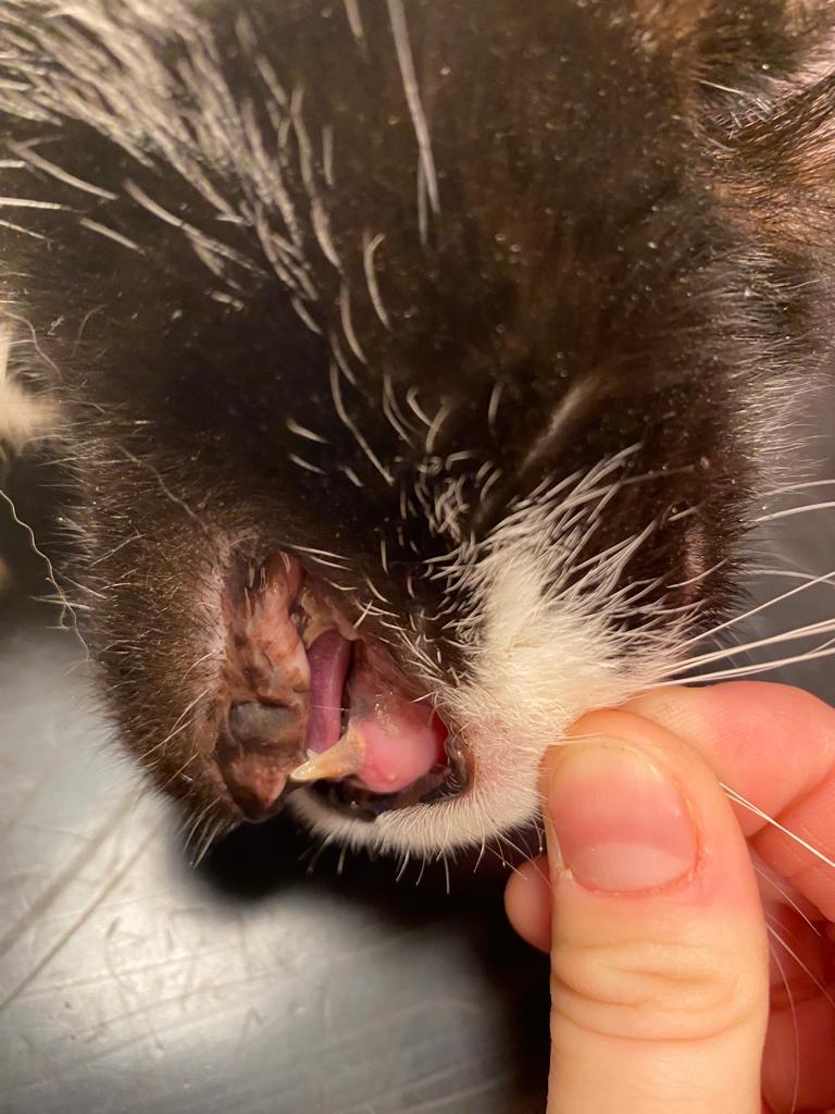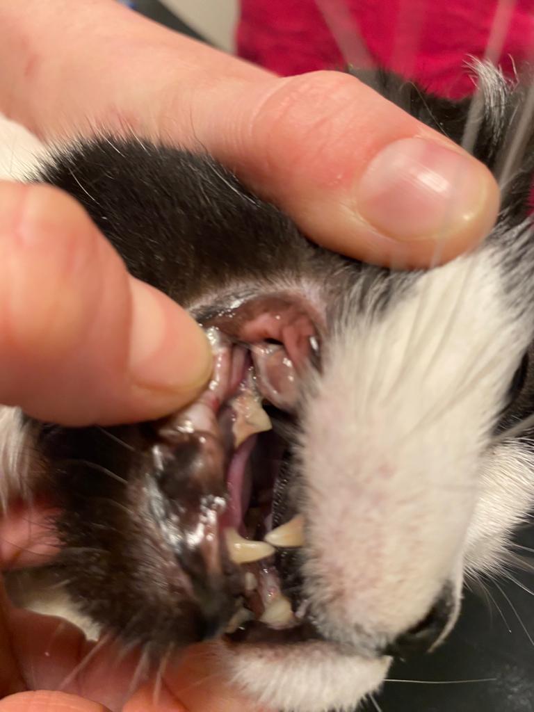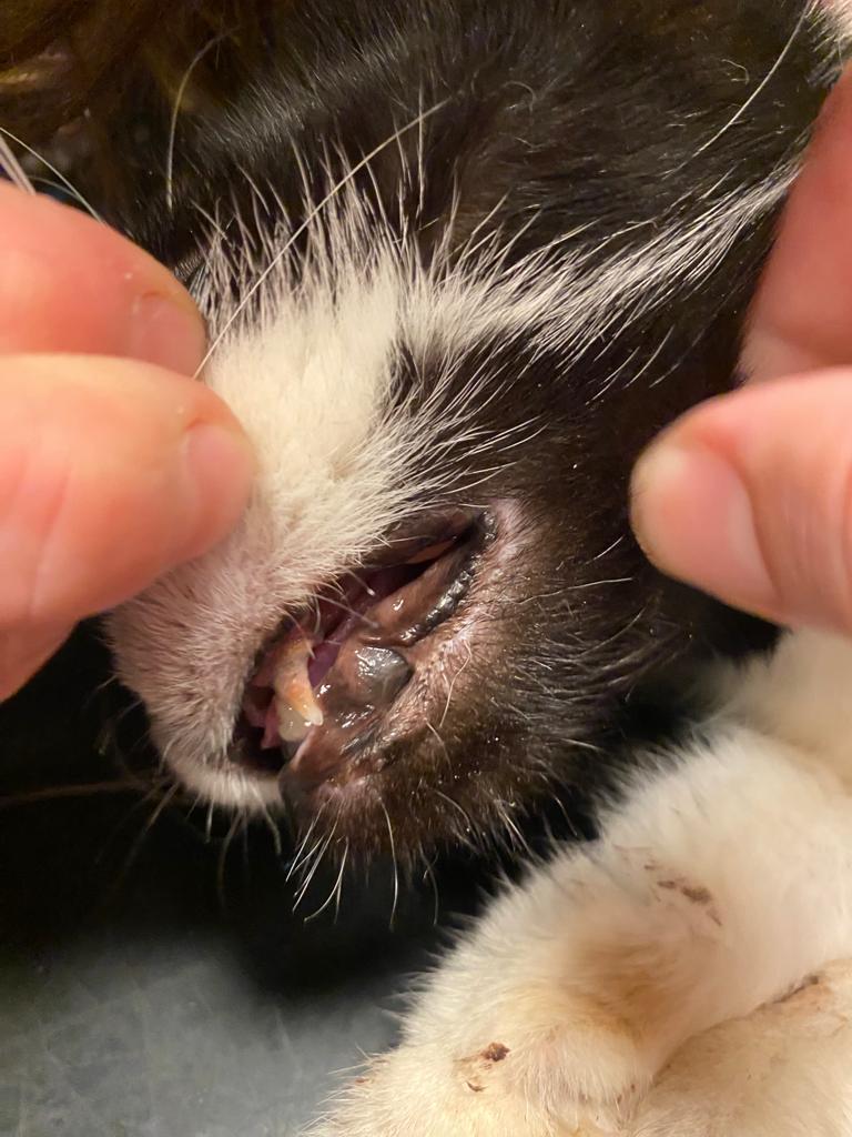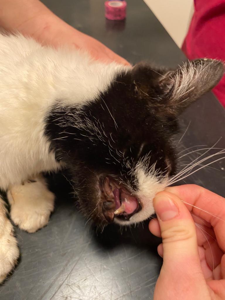 Hubená kočička Anežka má velmi špatné zuby, břišní kýlu a absces na zádech u kořene ocasu. Jakmile se dostane trochu do kondice, budeme řešit tyto její neduhy, zejména zuby jsou jedna velká katastrofa a abychom jí zatím ulevili, podáváme na doporučení veterináře léky na bolest.