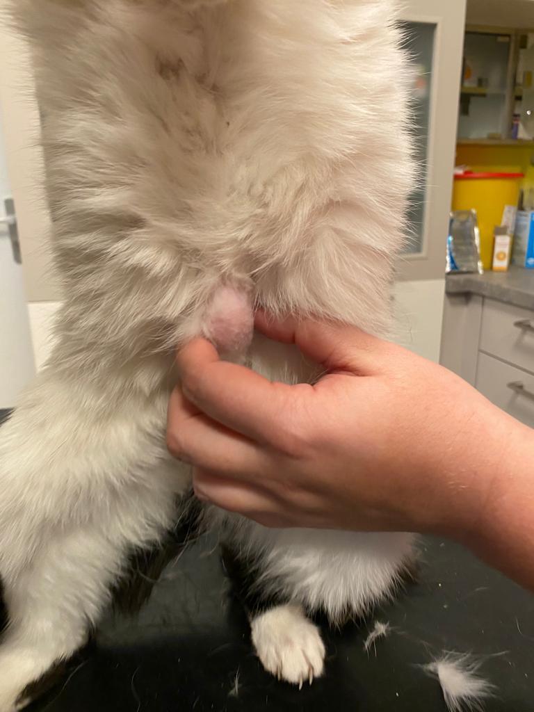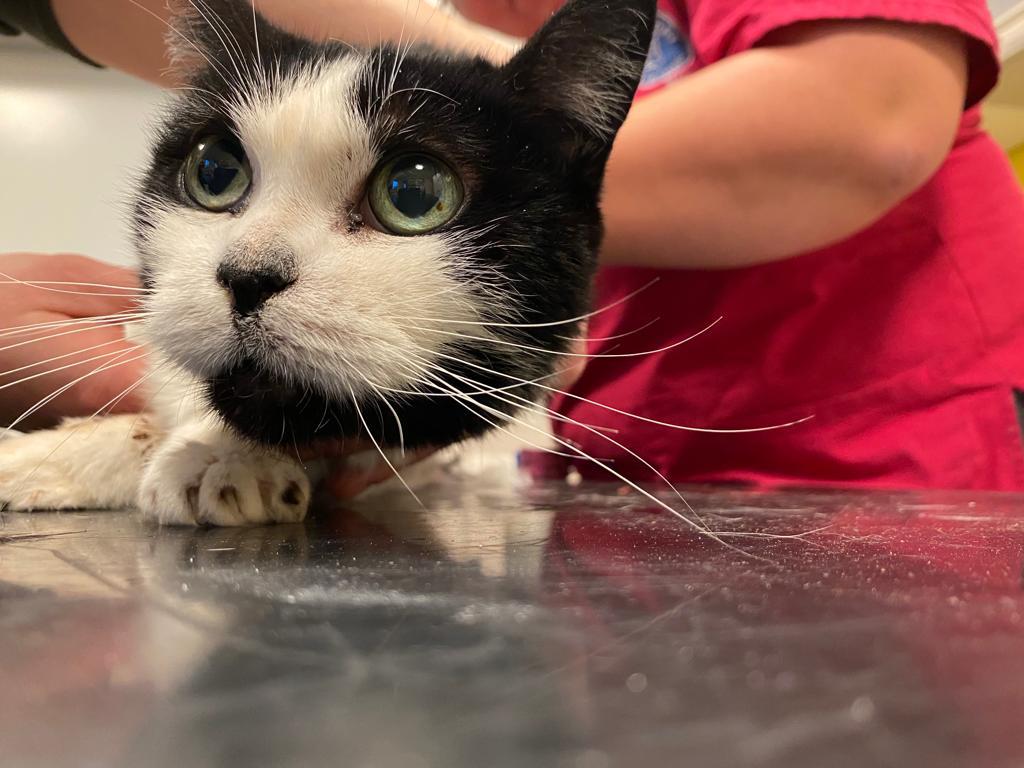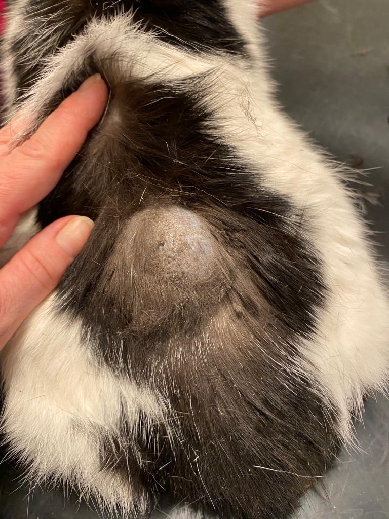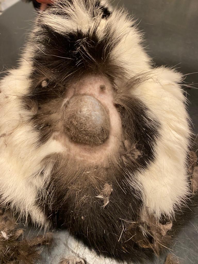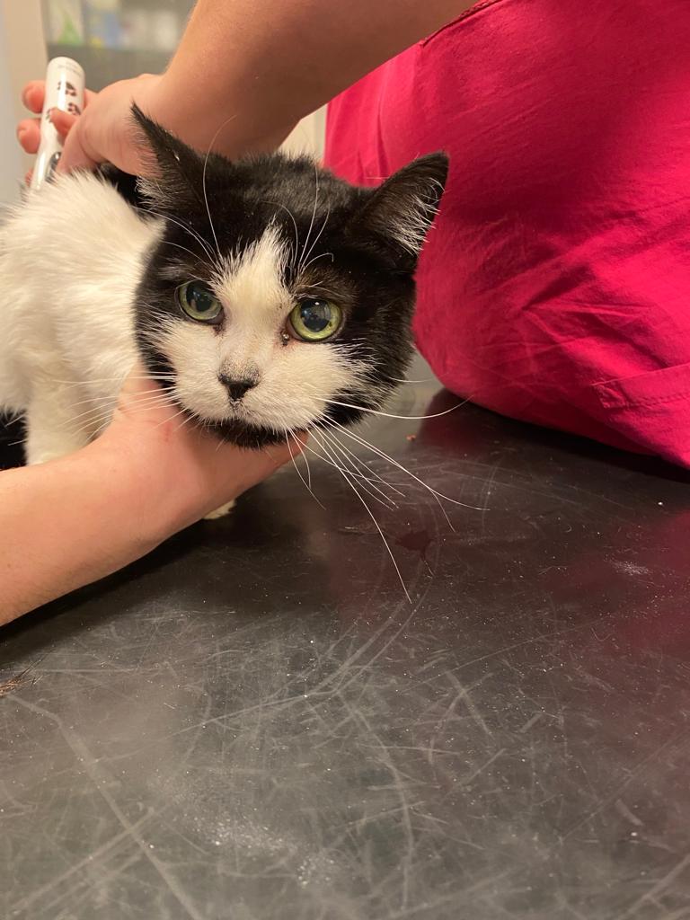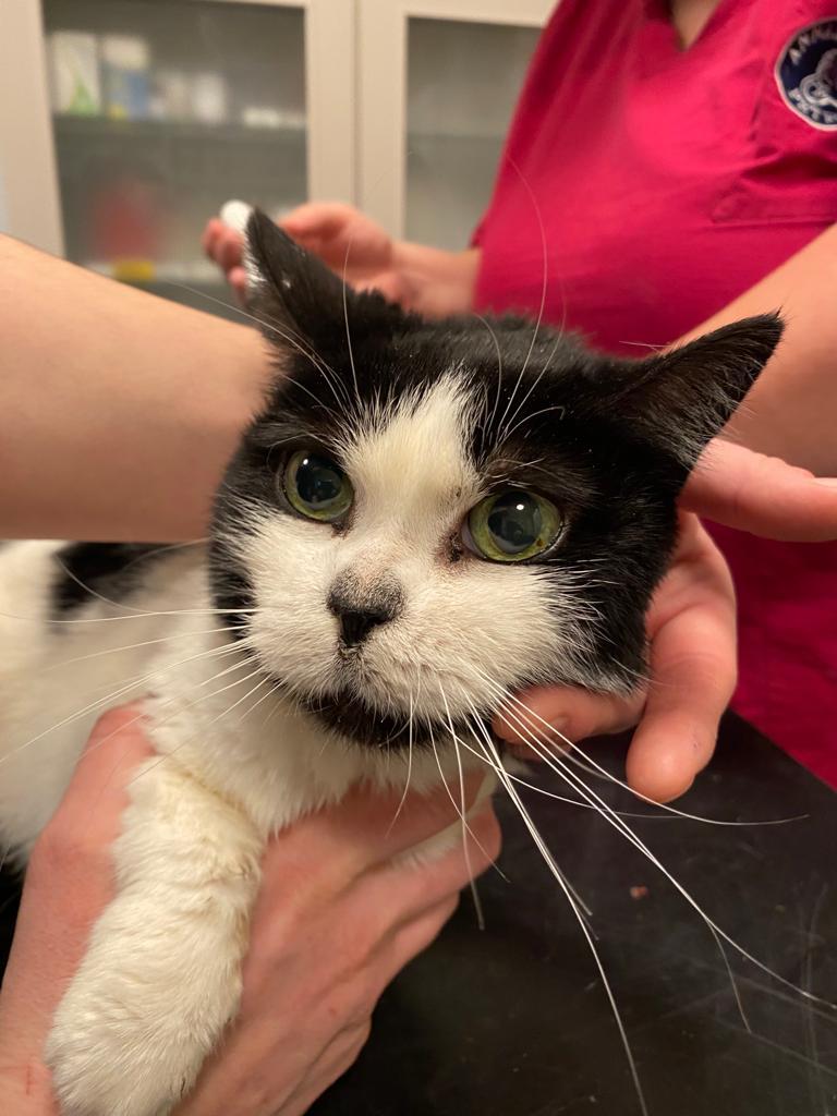Hubená kočička Anežka má velmi špatné zuby, břišní kýlu a absces na zádech u kořene ocasu. Jakmile se dostane trochu do kondice, budeme řešit tyto její neduhy, zejména zuby jsou jedna velká katastrofa a abychom jí zatím ulevili, podáváme na doporučení veterináře léky na bolest.