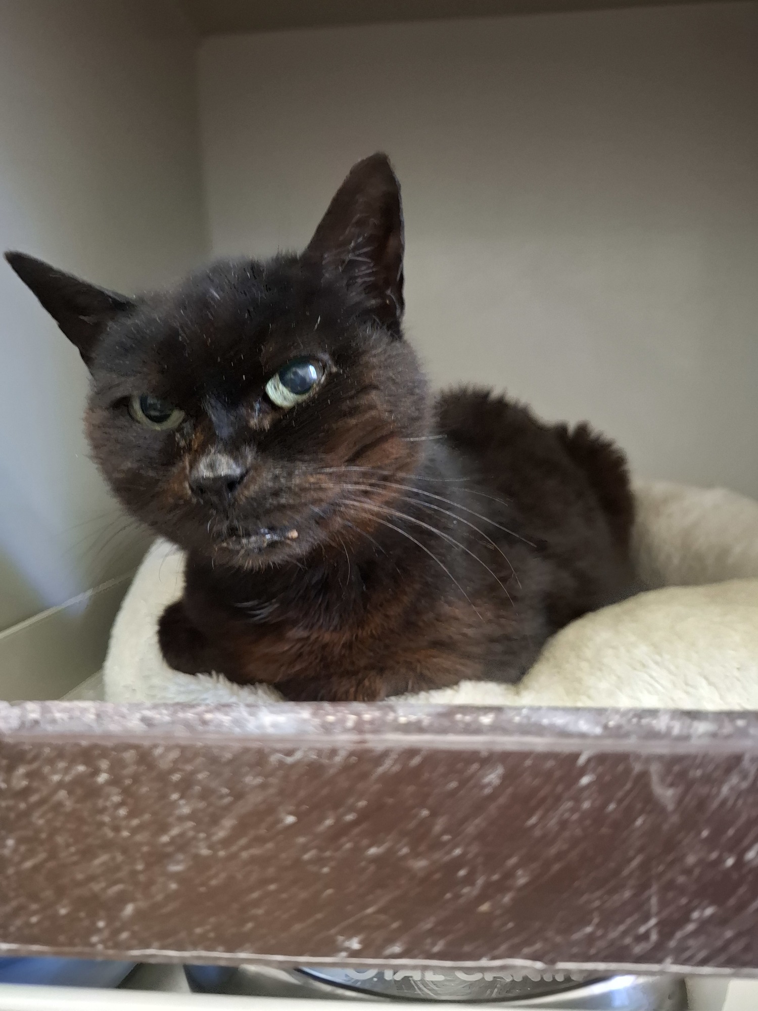 Bohunka k nám přišla s kocourkem Džemem po zemřelém majiteli. Protloukali se spolu kolem opuštěného domu a pozůstalí je začali řešit až ve chvíli, kdy se dům prodával. Kočička má bohužel zuby v hrozném stavu, může jíst jen konzervy, čeká ji tedy zubní zákrok, který ji zbaví bolesti, jež musí momentálně zažívat.
