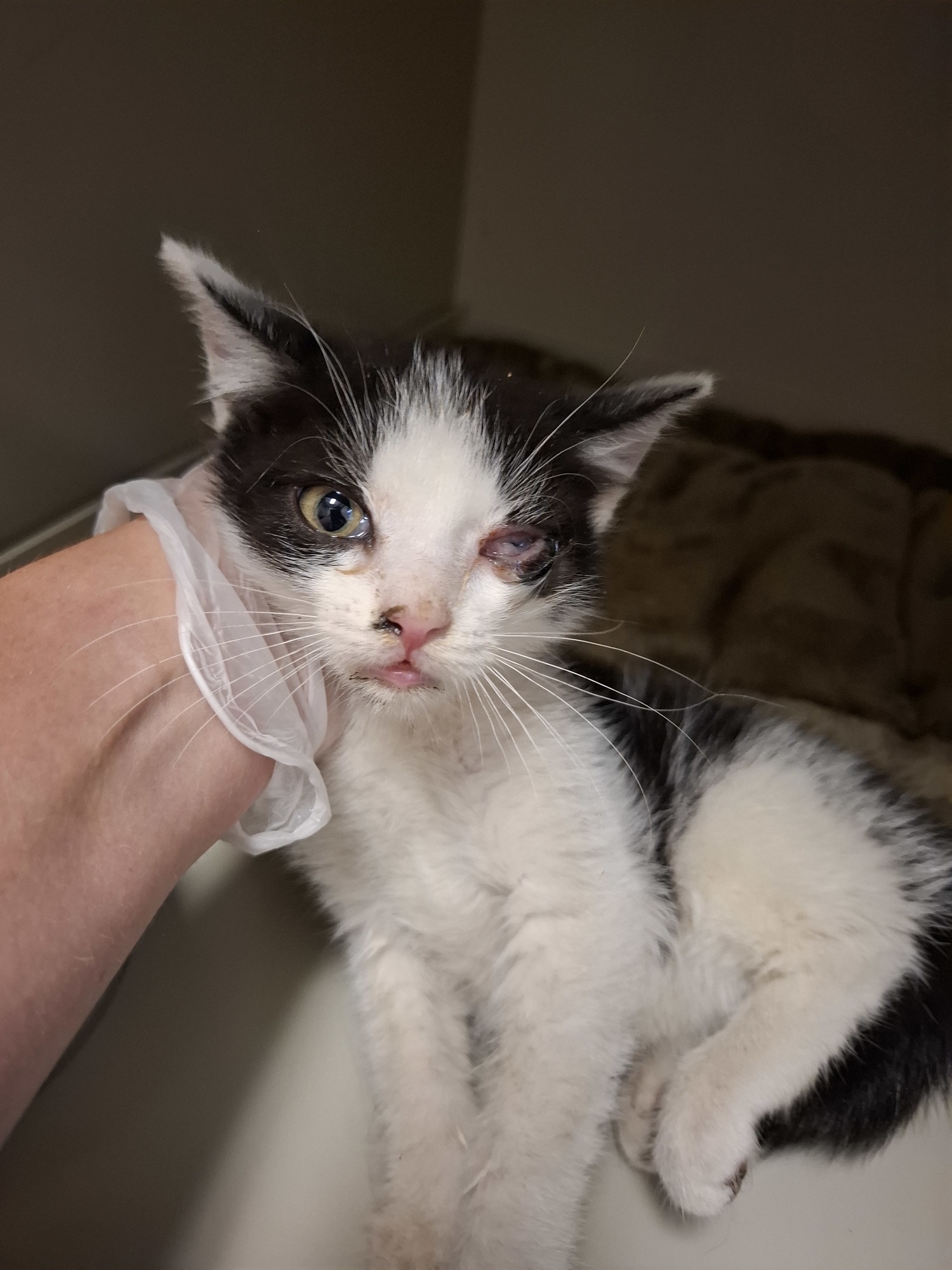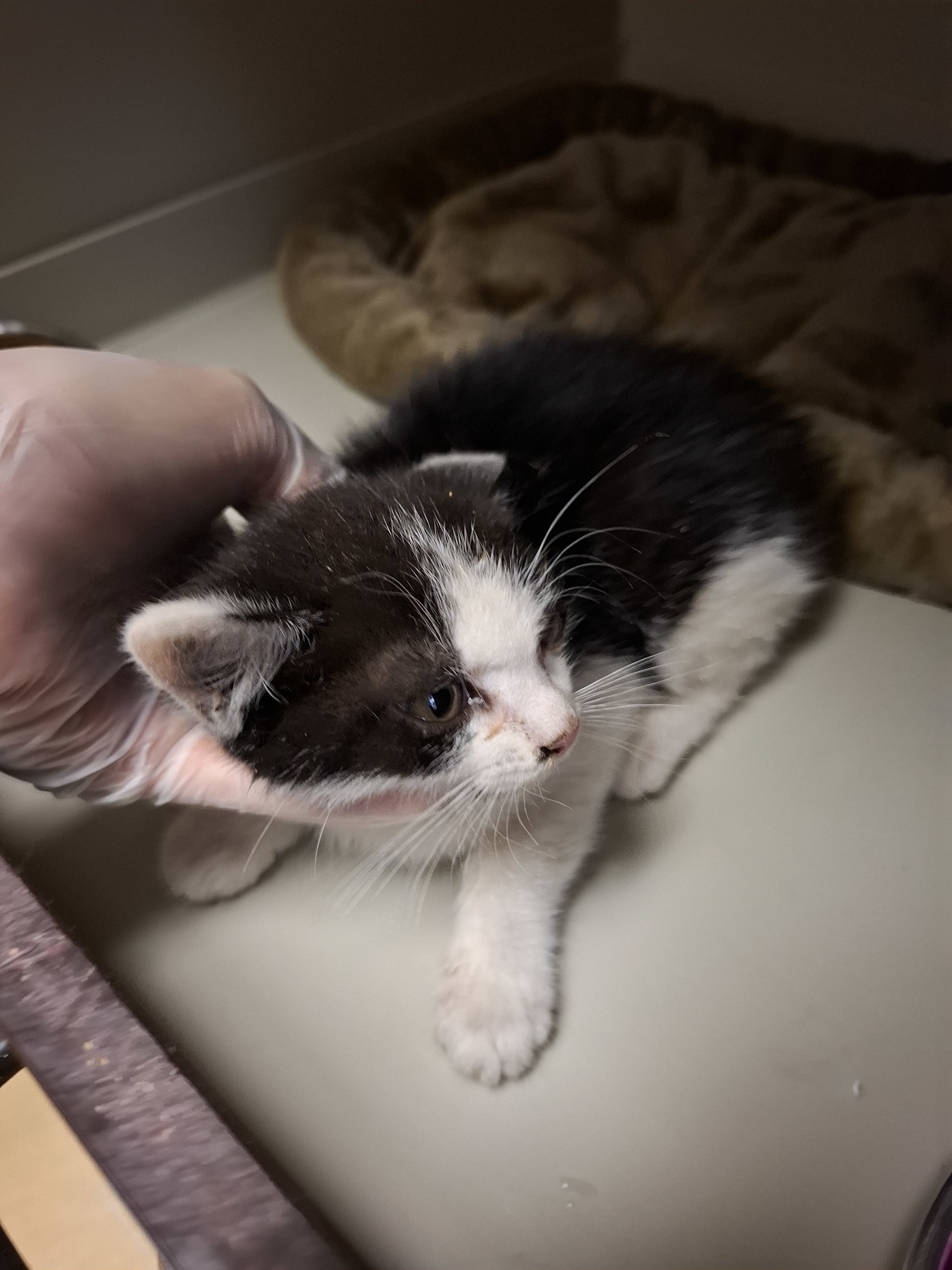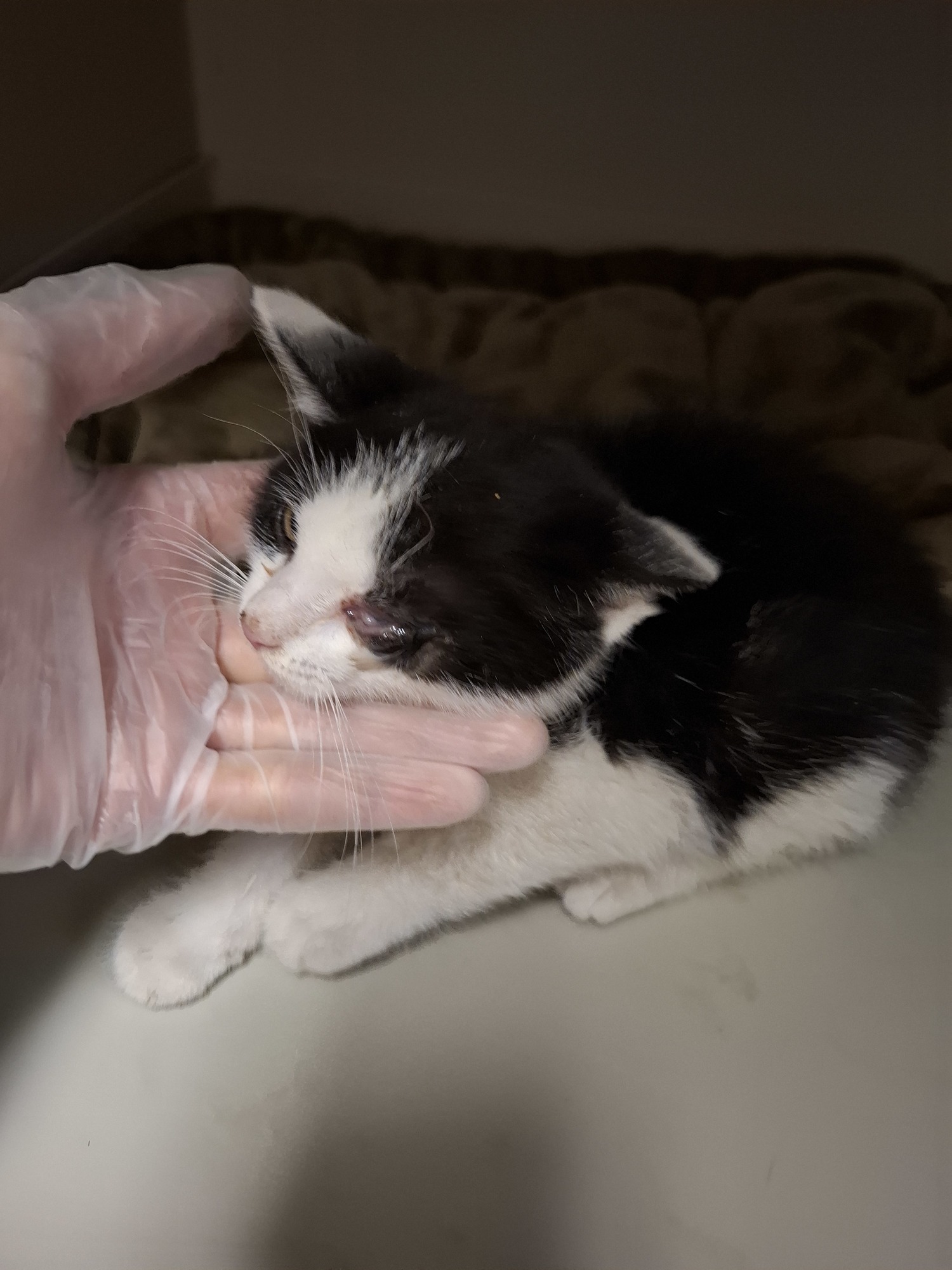 Bázlivé koťátko se projevuje plaše. Žil se sourozenci a maminkou v obrovské hromadě dřeva, je to takový mýválek, což je anglicky rascal. Věříme, že po léčbě bude v pořádku a urychleně pro něj budeme hledat domov, aby se vymazlil, dokud je maličký.