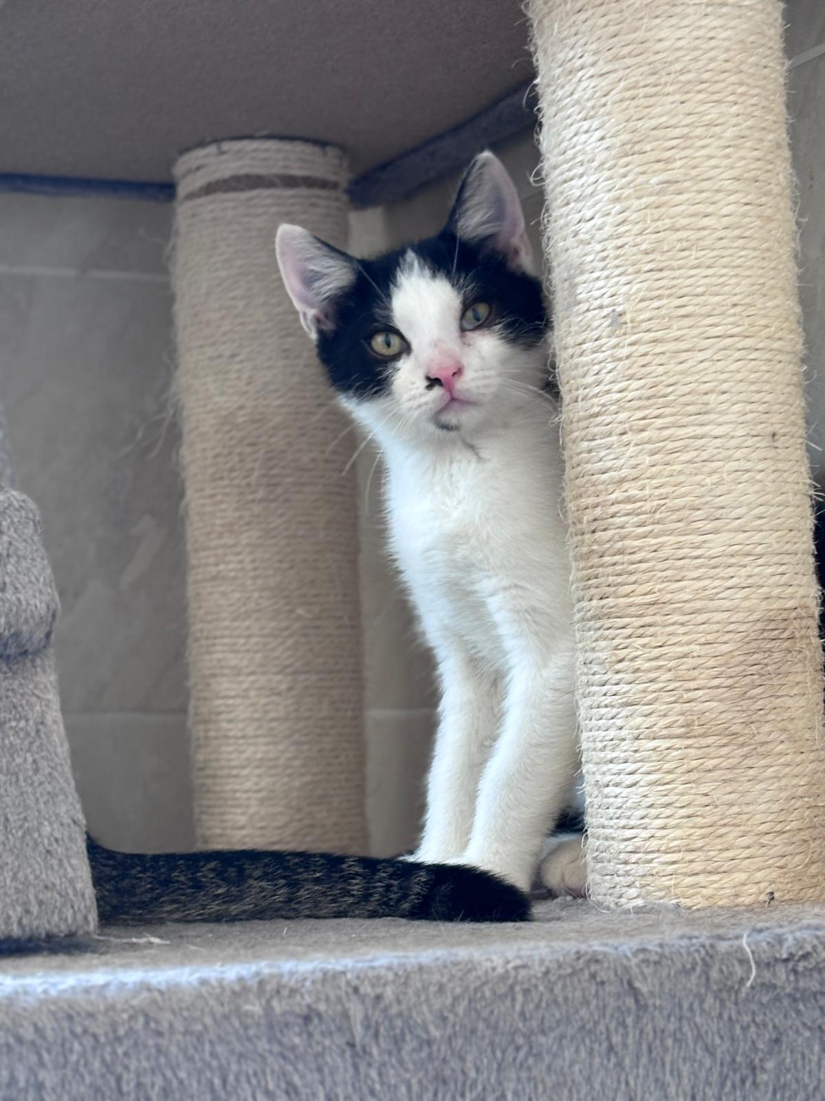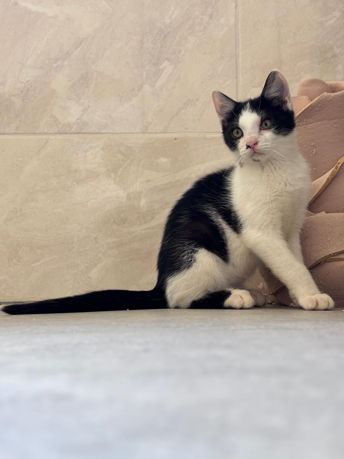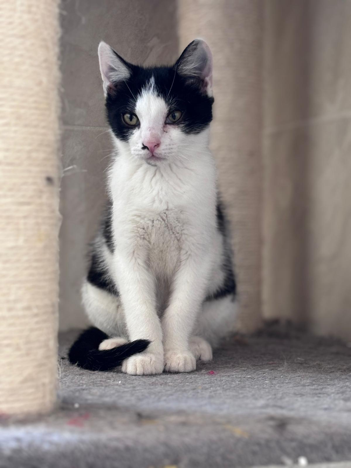 Bázlivé koťátko se projevuje plaše. Žil se sourozenci a maminkou v obrovské hromadě dřeva, je to takový mýválek, což je anglicky rascal. Věříme, že po léčbě bude v pořádku a urychleně pro něj budeme hledat domov, aby se vymazlil, dokud je maličký.