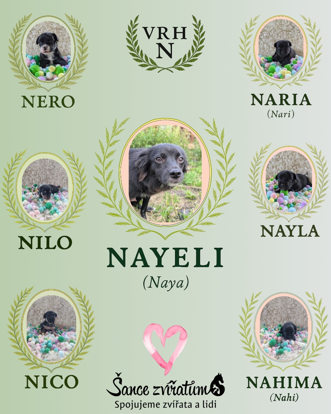 Nayla: elegantní a vyjímečné jméno arabského původu s významem „ta, která získává“, „úspěšná“, „vítězka“, „obdarovaná“ aneb ta, co drží moudrost v tlapkách, je energická, milující a s odvahou v srdci. Její budoucí rodina jí může zkráceně říkat Nay. Nayla bude koncem srpna a začátkem září připravena na dobrodružství v nové rodině a psaní nových psích kapitol života.