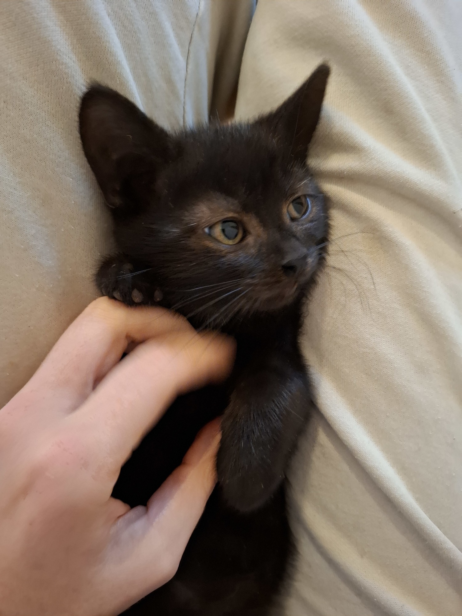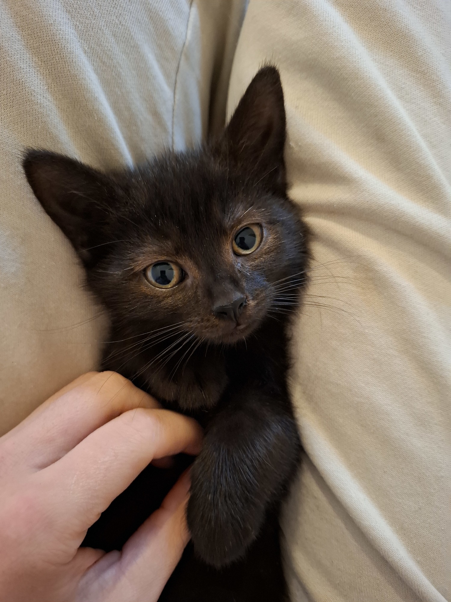 Pazuzu dostal jméno po mezopotámském démonovi, protože ač to bylo koťátečko do dlaně, snažil se pouštět hrůzu jako ten nejstrašlivější kocour na světě a dokonce kousl strážníka do prstu :) Po pár dnech se z něj stal předoucí mazlík, takže se nemusíte ničeho bát :)