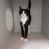 Kocourek, ještě kotě, odchycený v rámci kastračního programu v Ploužnici. Je po operaci kýly. Jako ostatní jeho příbuzní, potřebuje chvíli čas na seznámení se a pak si stydlivě užívá mazlení...