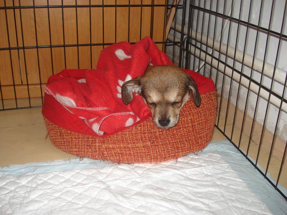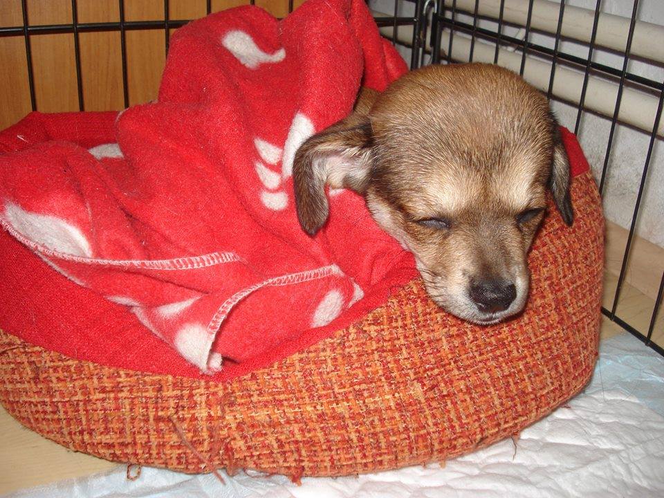 Lottynka je zatím moc unavená, stále polehává a je ráda, že je konečně v teple, nevíme, jak dlouho se toulala, než ji nějaký obyval Hradiště odnesl na policii.