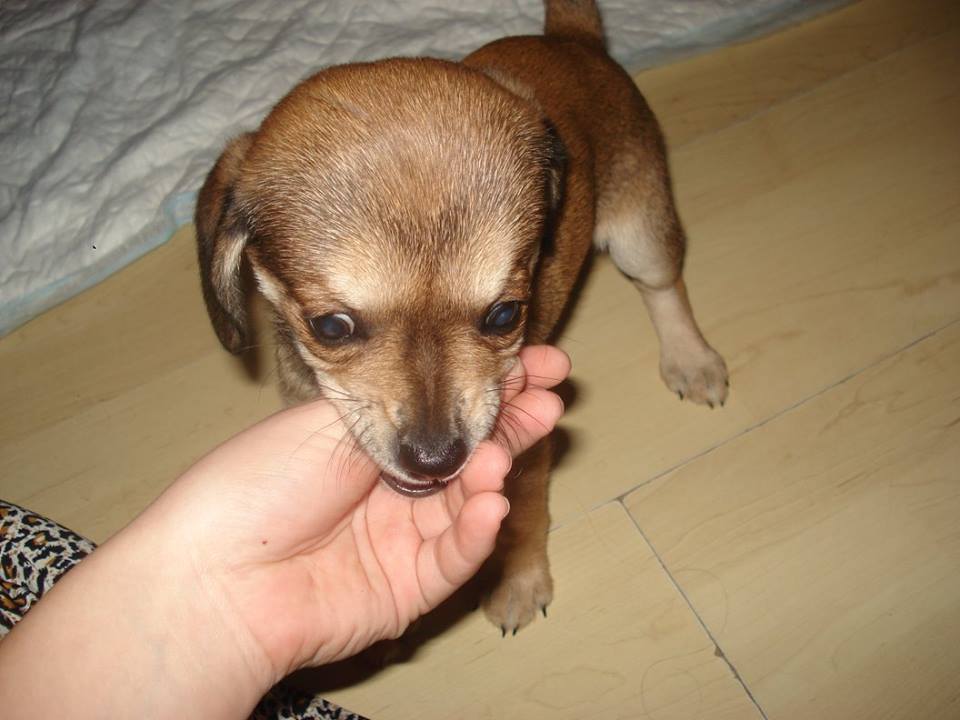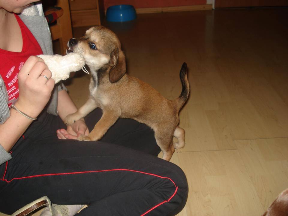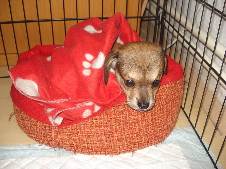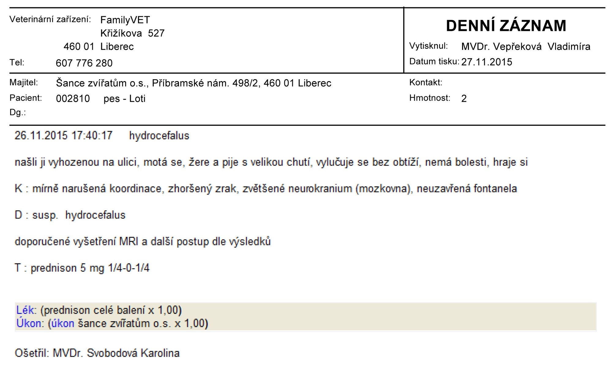 Lotynka je cca 6-7 týdenní štěně, které měl někdo donést na MP Mnichovo Hradiště. K nám se dostala 26.11.2015 a dočaskářka si ihned všimla toho, že fenečka špatně drží rovnováhu, motá se a má podivně velkou hlavičku. Po návštěvě u veterináře padl verdikt, který jsme si opravdu nepřáli - hydrocefalus. Jde o nahromadění mozkomíšního moku ve schránce lebeční. Většina štěňat s touto diagnózou rychle umírá. Věříme však, že když Lottynka svůj osud zatím zvládla i přes svou podvyživenost, má stále potenciál bojovat.