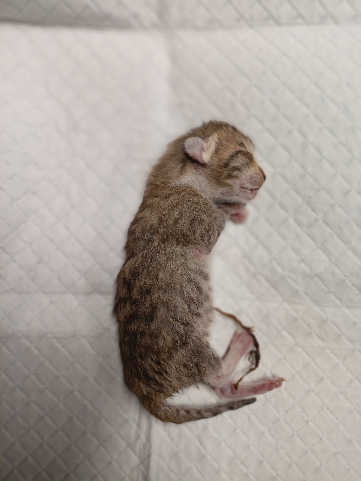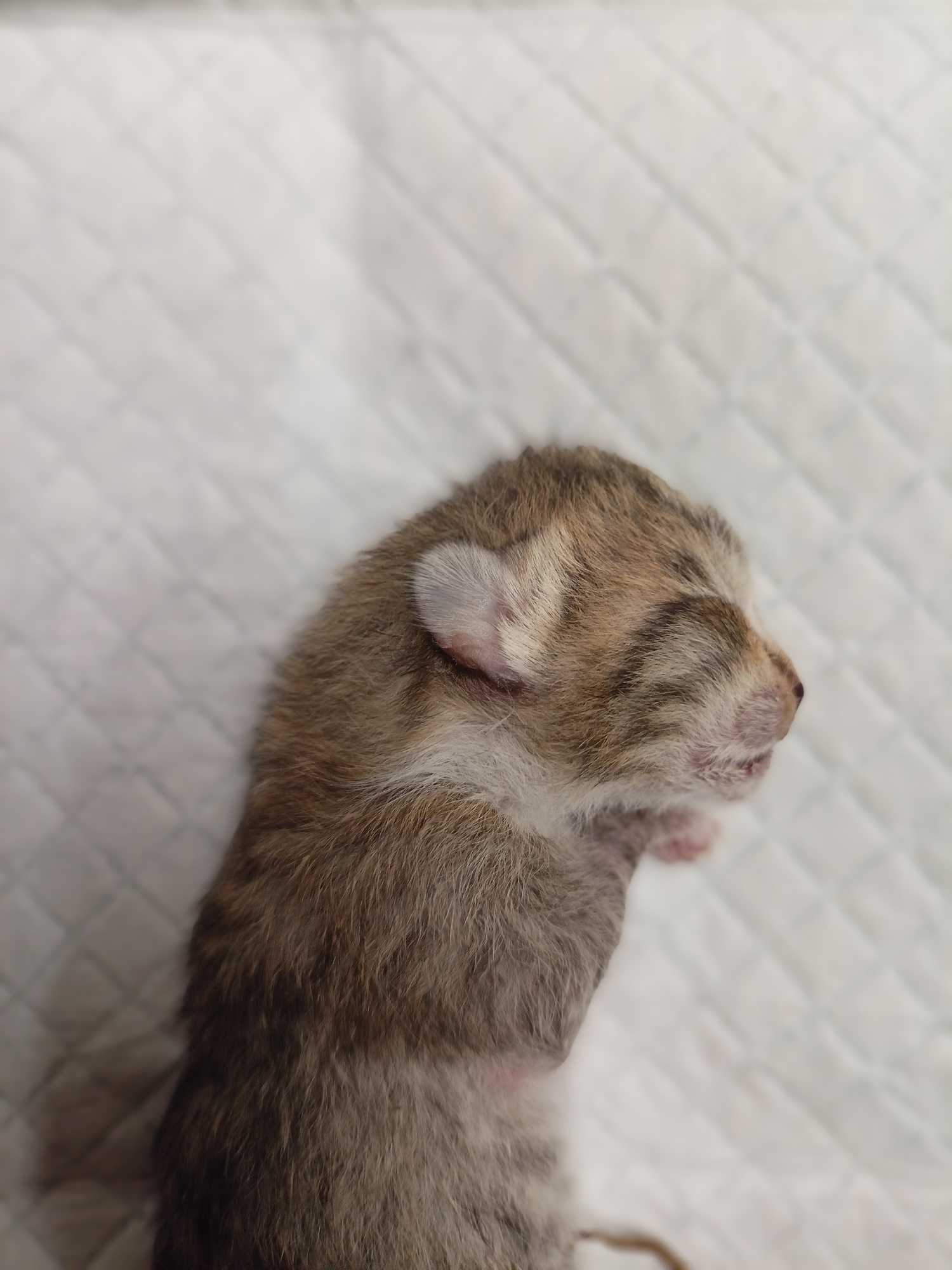 Toto maličkaté cca dvoudenní koťátko nám přivezla Městská policie Česká Lípa. Bylo nalezeno při kastračních odchytech na Svárově v České Lípě v keři. Upozornila na ně paní krmička. Bohužel nebyla schopna identifikovat, která z divokých koček je její maminkou, nicméně nás obeznámila s tím, že se o ně nikdo nestará. Koťátko jsme tedy přijali do naší péče, prošlo veterinární prohlídkou a krátce po převozu do depozita vzhledem k velkému podchlazení v tentýž den (den příjmu) 10.6.2024 zemřelo. Moc nás to mrzí. Jeho sestřička o svůj život bojuje jako lvice v dočasné péči v Liberci.